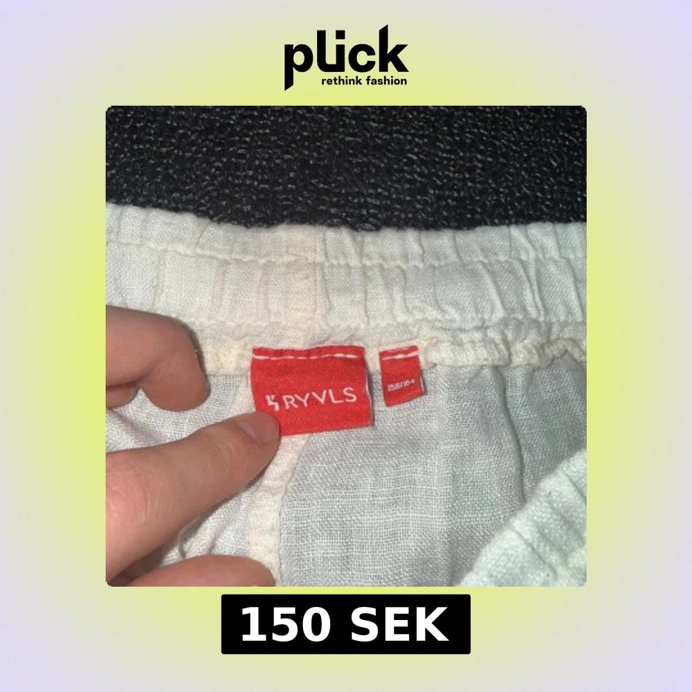 Säljer ett par vita linnebyxor från RYVLS med elastisk midja och raka ben. Byxorna har en avslappnad passform och är tillverkade i svalt linnematerial, perfekta för varmare dagar. Klassisk look med fickor i sidorna och enkel design.