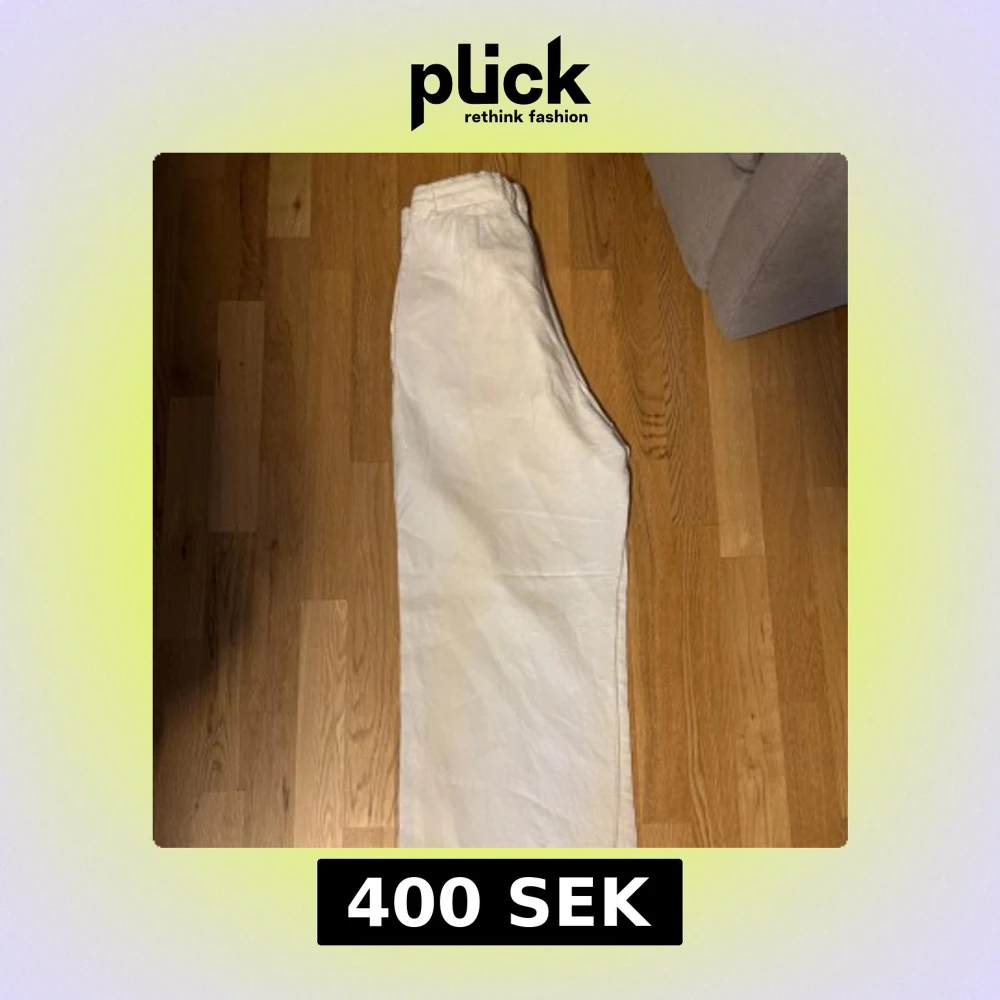 Säljer ett par vita linnebyxor från Weekday i wide fit. Byxorna har raka ben, hög midja och klassisk look med fickor fram och bak. Perfekta för en chill och stilren vibe under varmare dagar. Har endast använts ett par gånger. Inga skador eller fläckar på tyget