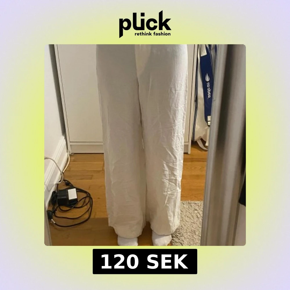 Snygga vita linnebyxor i wide fit med rak passform. Byxorna är tillverkade i en blandning av viskos, linne och bomull vilket gör dem luftiga och perfekta för varma dagar. De har en enkel och stilren look som passar till allt. Använda en gång och provisoriskt uppsydda ca 3 cm.