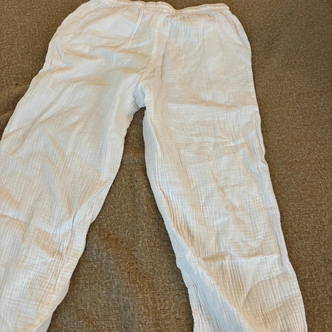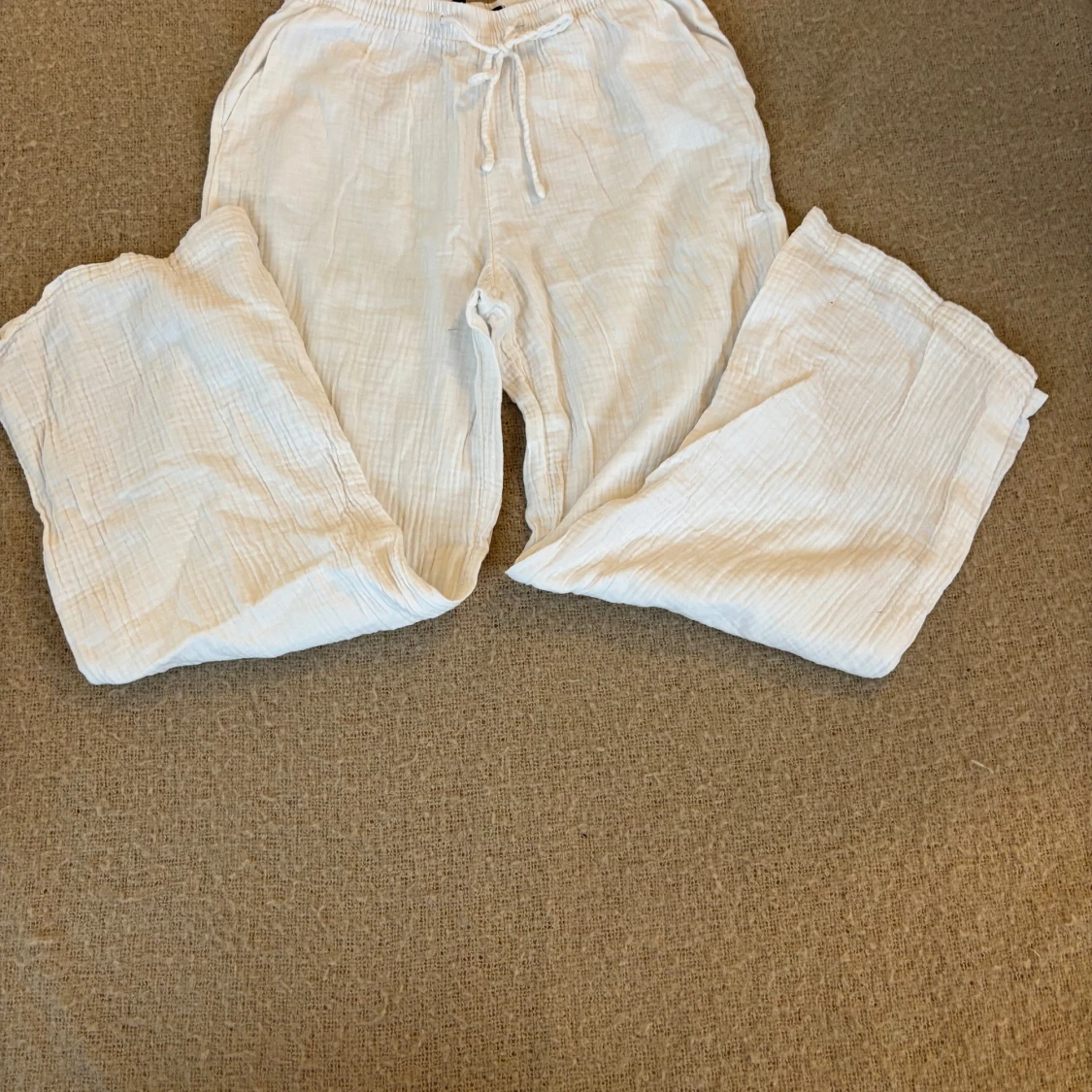 Snygga och bekväma vita linnebyxor med dragsko i midjan. Perfekta för en avslappnad stil med en loose passform. Byxorna har en lätt och luftig känsla, idealiska för varma dagar.