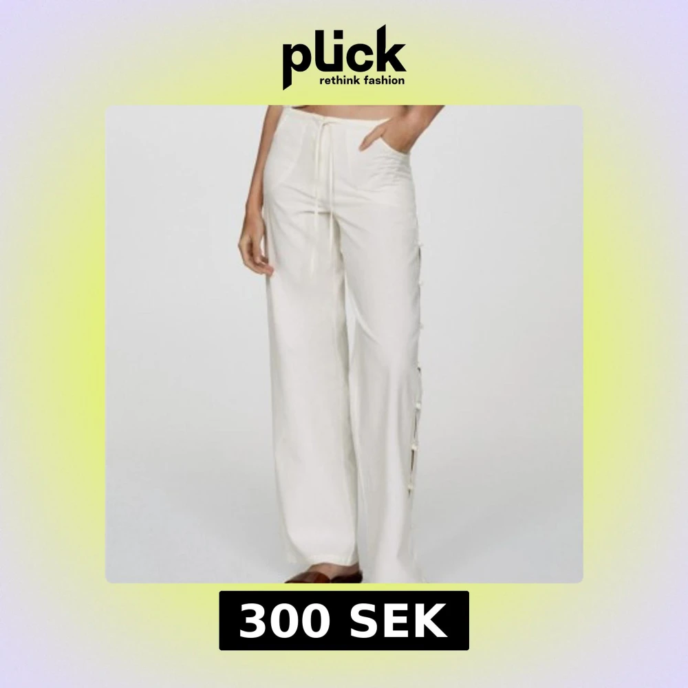 Snygga vita linnebyxor med hög midja och vida ben. Byxorna har knyt i midjan och coola slitsar längs sidorna som hålls ihop med knytband. Perfekta för en chill och trendig sommarlook.