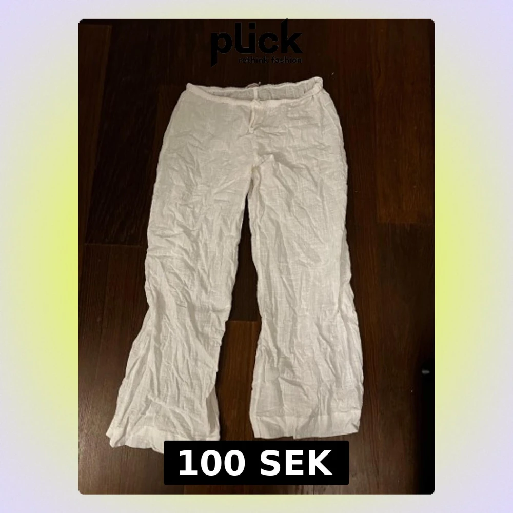 Säljer ett par fräscha vita linnebyxor med rak passform. Byxorna har en enkel design och är tillverkade i lätt och luftigt linnematerial, perfekta för varma dagar. De har elastisk midja och är riktigt sköna att bära.