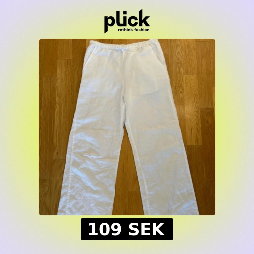 Snygga vita linnebyxor med rak och loose passform. Byxorna har resår i midjan och sidfickor, perfekta för en chill och avslappnad stil. Lätta och luftiga, passar grymt till sommaren. Passar bra för mig som är 164cm och har storlek w25 i byxor ❤️ skriv vid funderingar