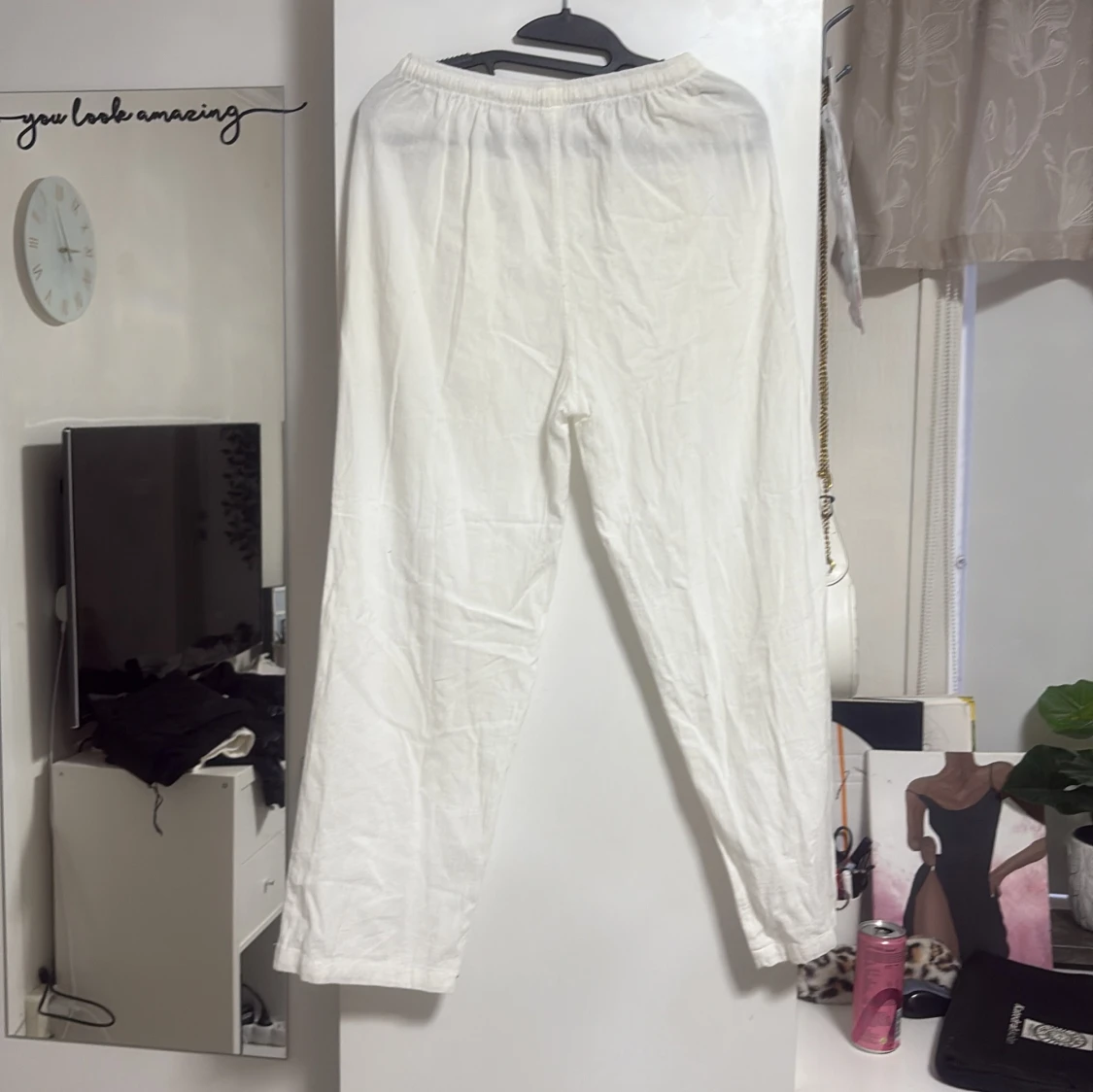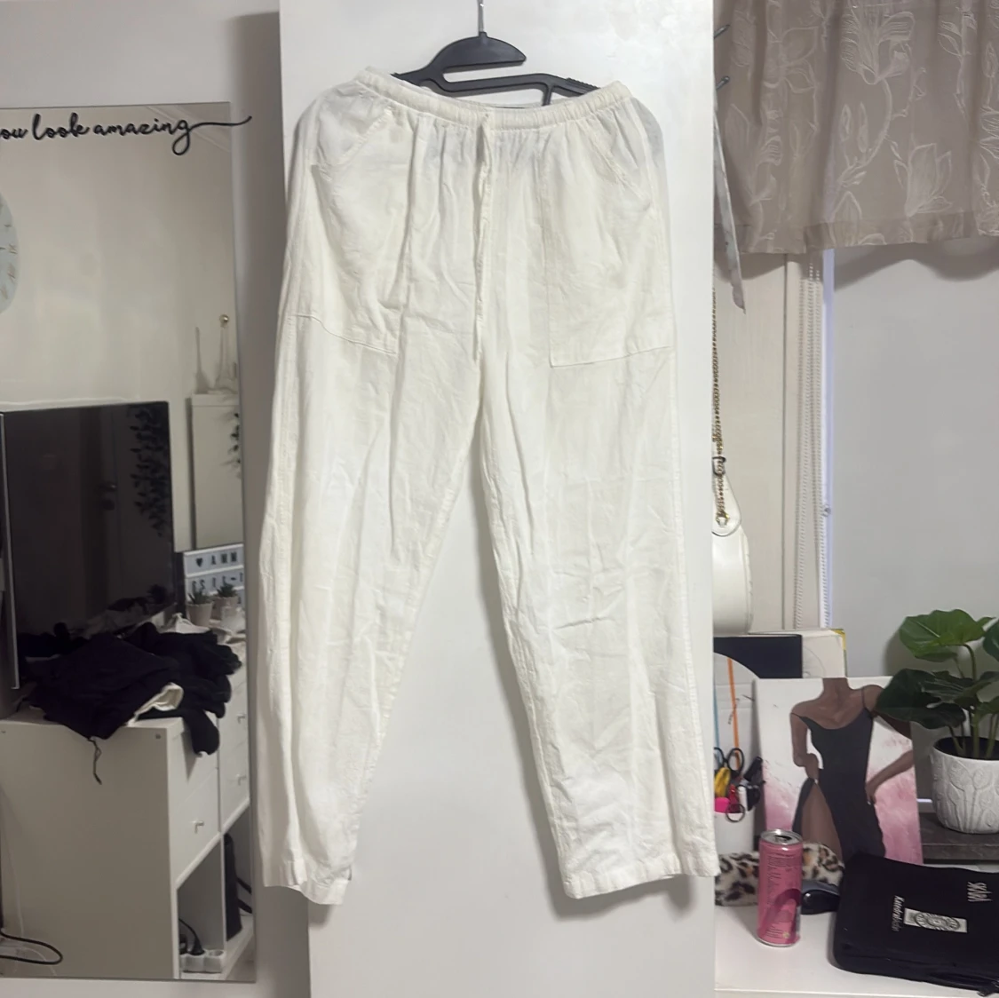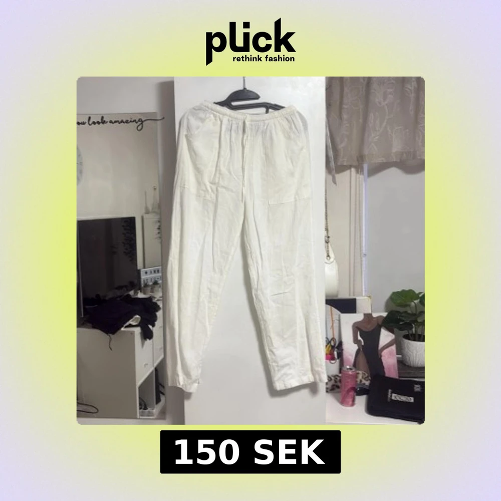Säljer ett par fräscha vita linnebyxor med skön resår i midjan och stora fickor framtill. Byxorna har en rak passform och är perfekta för chill dagar eller när du vill ha en clean och enkel look. Materialet är lätt och luftigt, vilket gör dem nice för varmare väder.