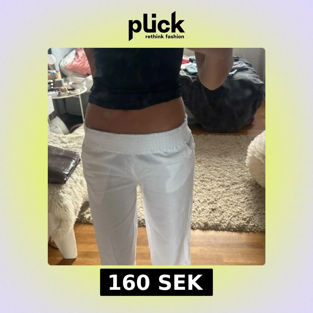 Säljer ett par vita linnebyxor med skön resår i midjan och utsvängda ben💞 säljer då de är för korta, tar emot prisförslag!!