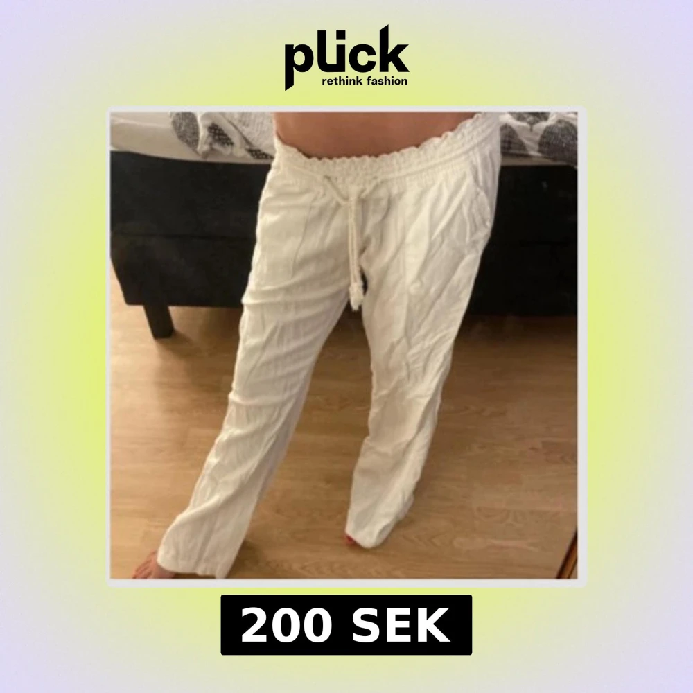 Säljer ett par vita linnebyxor med bred resår i midjan och snörning framtill. Byxorna har raka ben, sidfickor och är tillverkade i ett luftigt linnematerial. Perfekta för varma dagar och chill vibes. Säljer pågrund av att dom är förstora dom är lite söndriga vid snöret men inget man tänker på