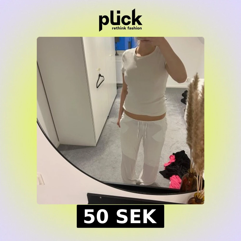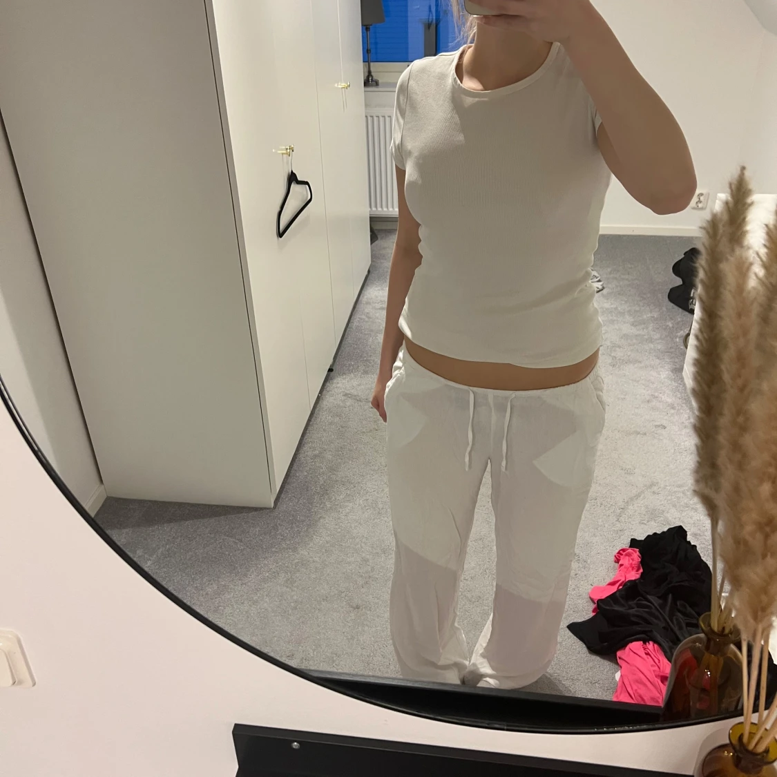 Säljer ett par vita linnebyxor med avslappnad passform och dragsko i midjan. Byxorna har raka ben och sidfickor, perfekta för en chill och luftig stil. Superbekväma och lätta att matcha med allt.