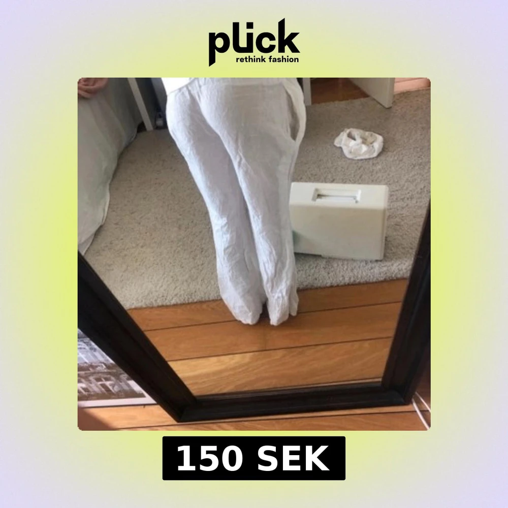 Säljer ett par fräscha vita linnebyxor str XS och lågmidjade. Byxorna har raka ben och är perfekta för varma dagar. Har tre små fläckar på ett av benen, knappt märkbart