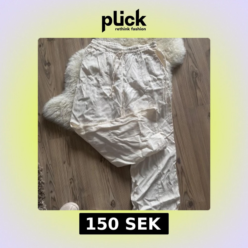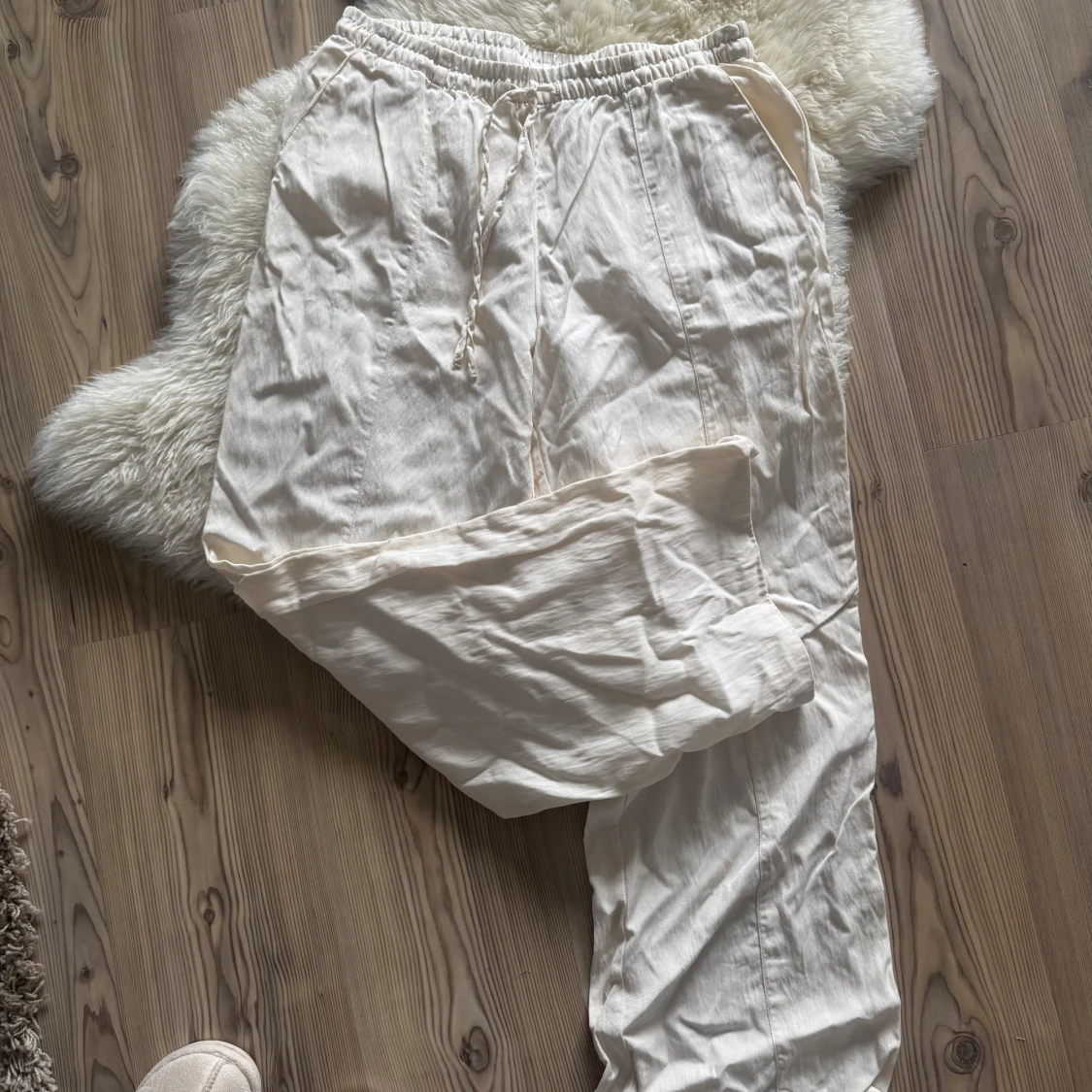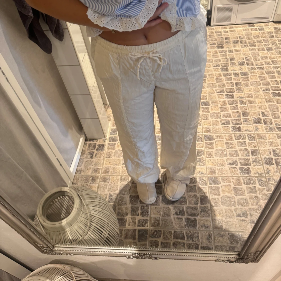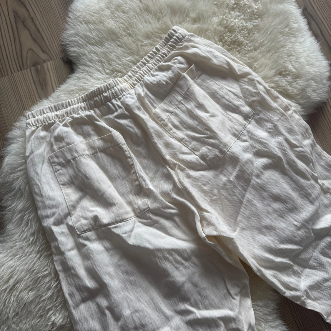 Säljer ett par vita linnebyxor med avslappnad passform och resår i midjan. Byxorna har snörning framtill, raka ben och praktiska fickor både fram och bak. Perfekta för varma dagar och ger en chill vibe.