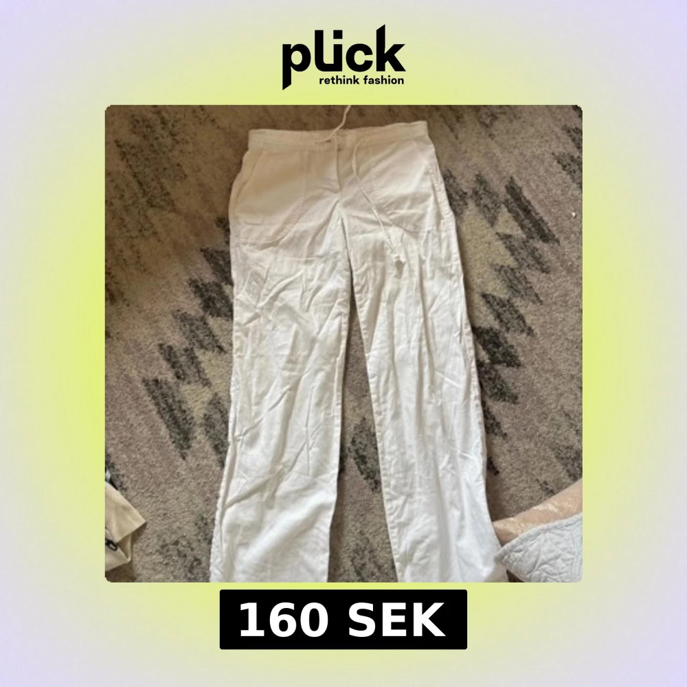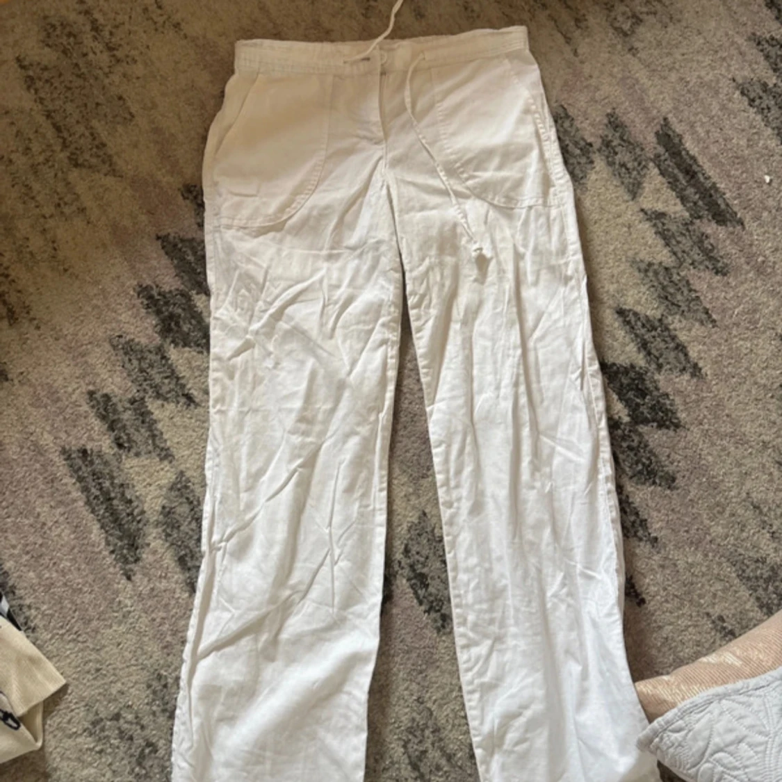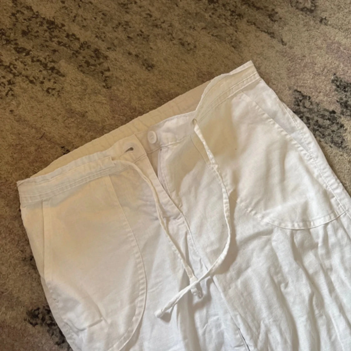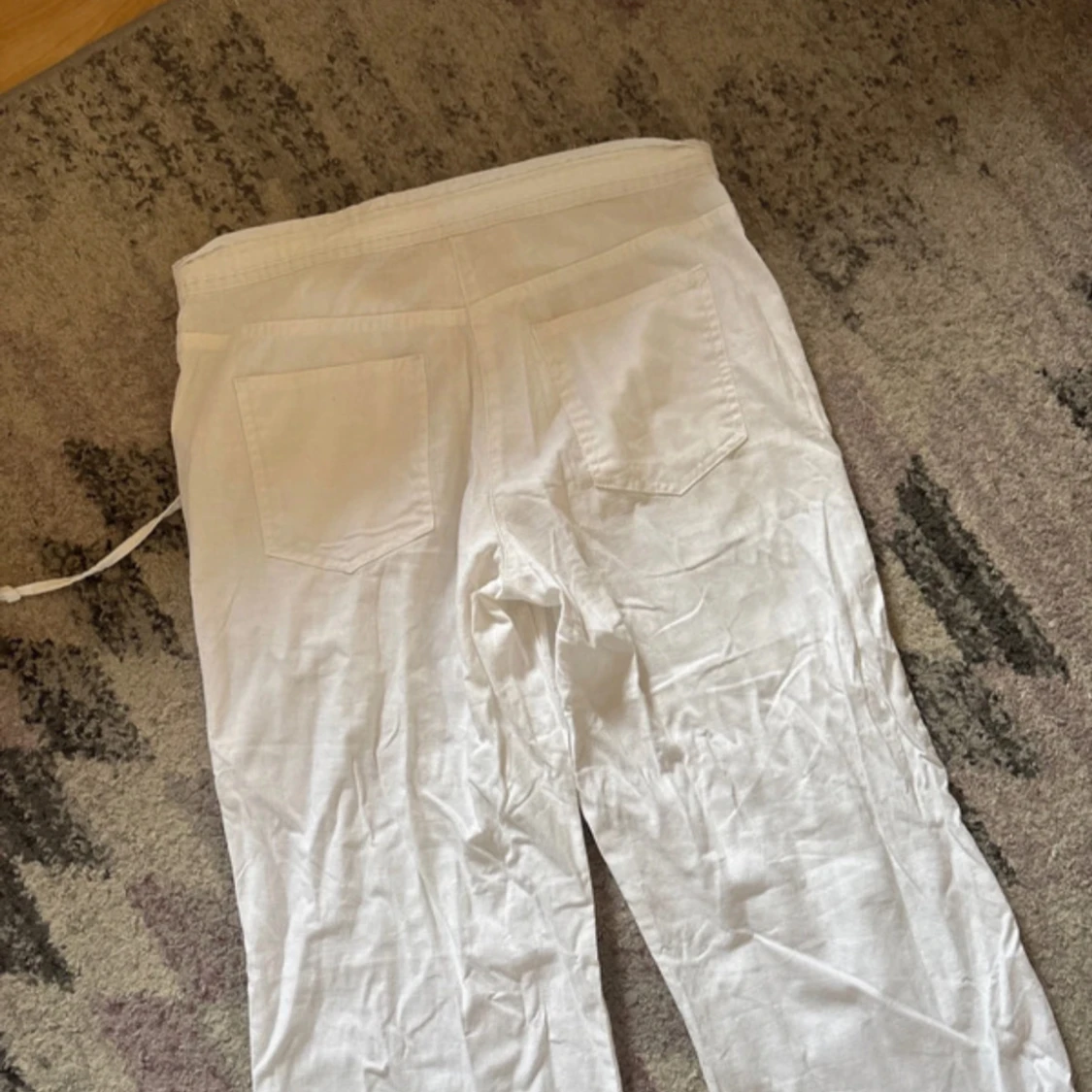 Säljer dessa vita linnebyxor i mycket bra skick, de är endast använda ett fåtal gånger. Säljer pågrund av att de är för stora för mig och det är därför jag har vikit ner dem en gång i midjan på första och andra bilden.🩷 storlek 34