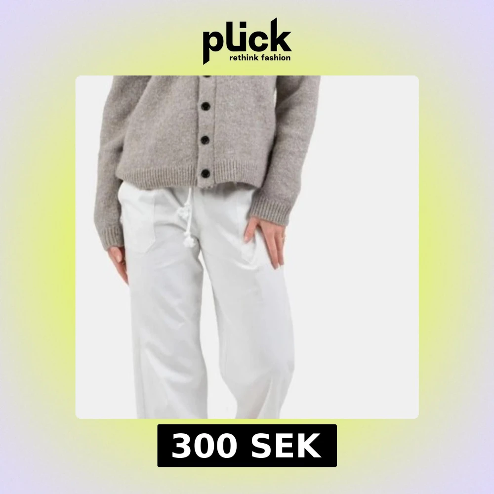 Säljer ett par vita linnebyxor med bred resår i midjan och snörning med tofsar. Byxorna har raka ben och sidfickor, perfekta för en avslappnad stil.