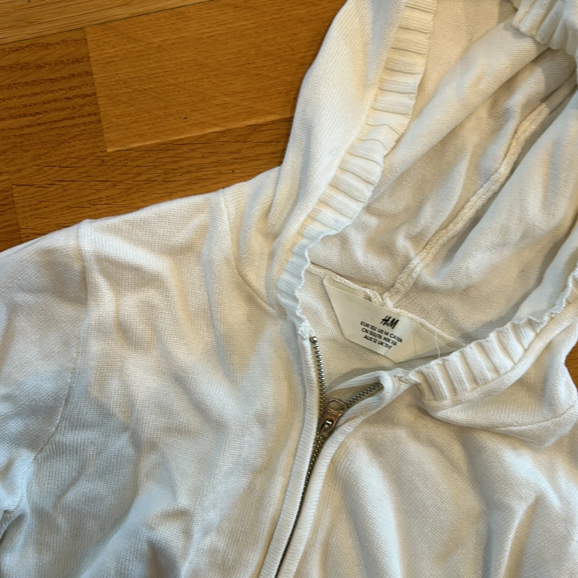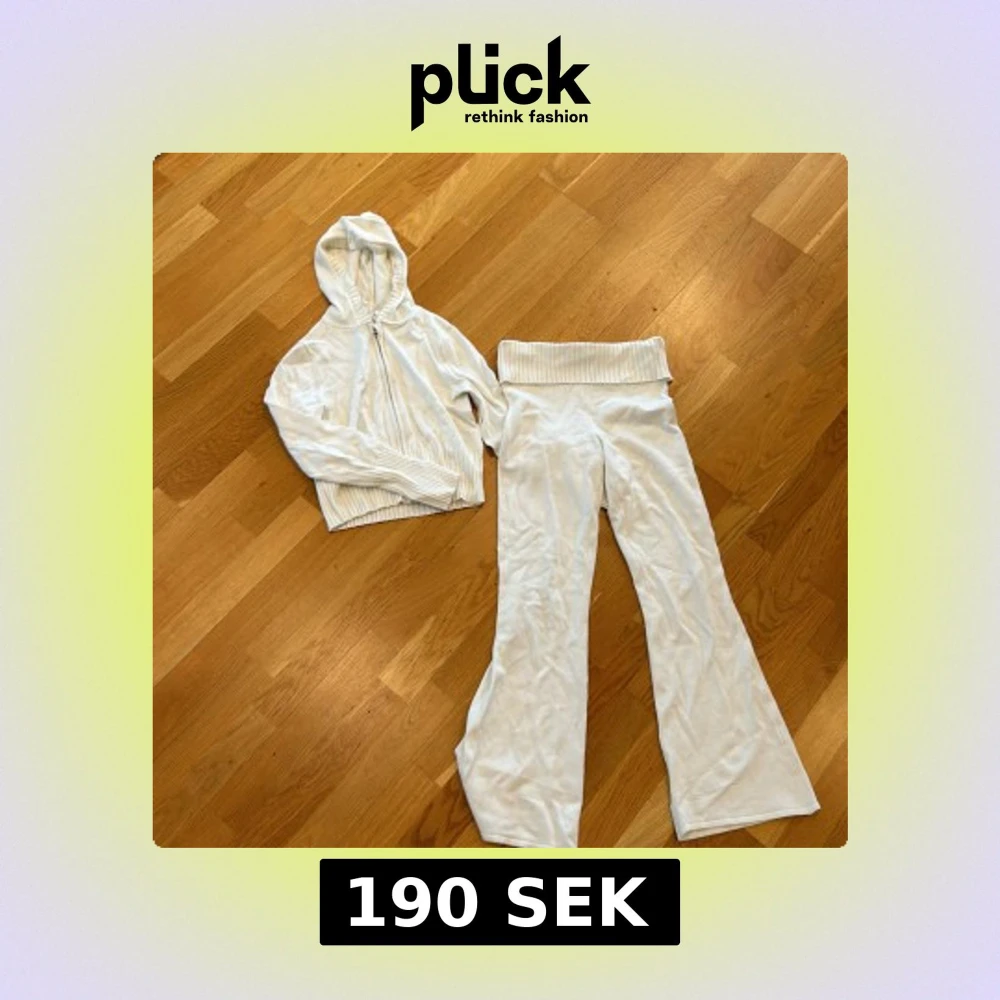 Säljer ett par vita mjukisbyxor från H&M med bred ribbad midja och en matchade sip-up hoodie. Byxorna har en rak passform och är tillverkade i mjukt material som är skönt att ha på sig. Perfekta för en avslappnad stil.