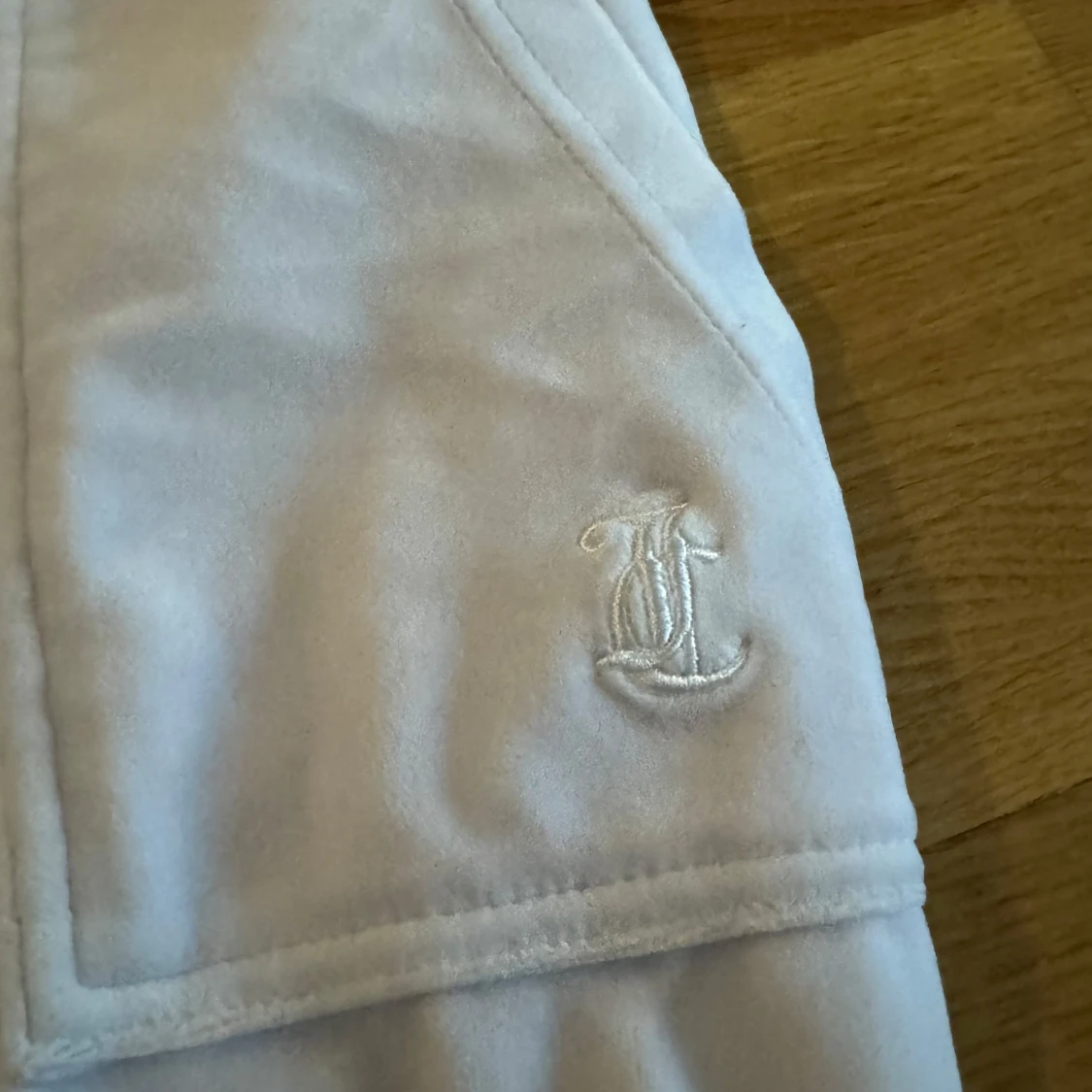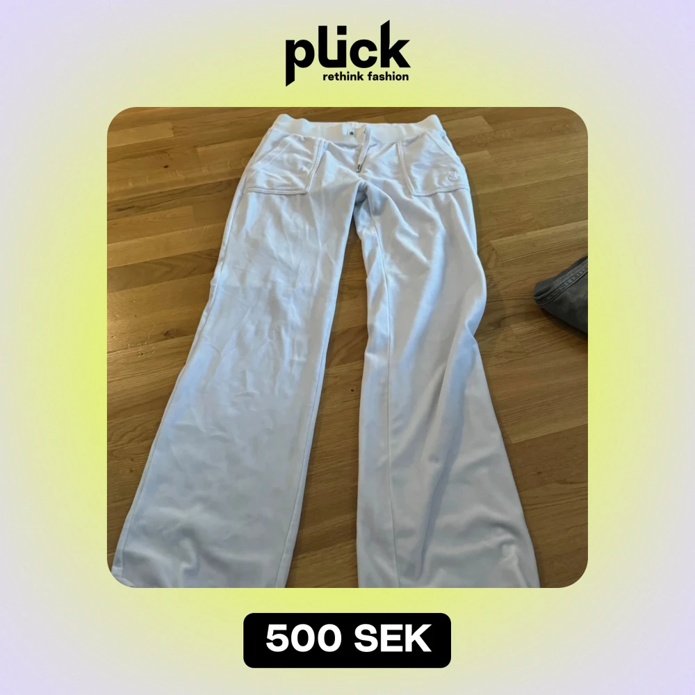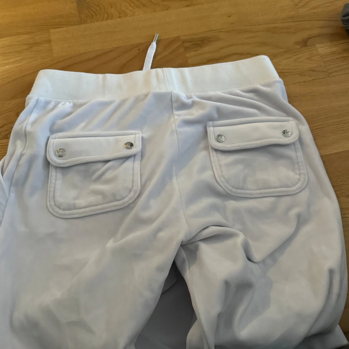 Säljer ett par vita mjukisbyxor i mycket bra skick. De har en broderad logga på framsidan och praktiska fickor med knappar bak. Perfekta för en avslappnad stil och bekväma att bära. Passar till både vardag och mysiga hemmakvällar.