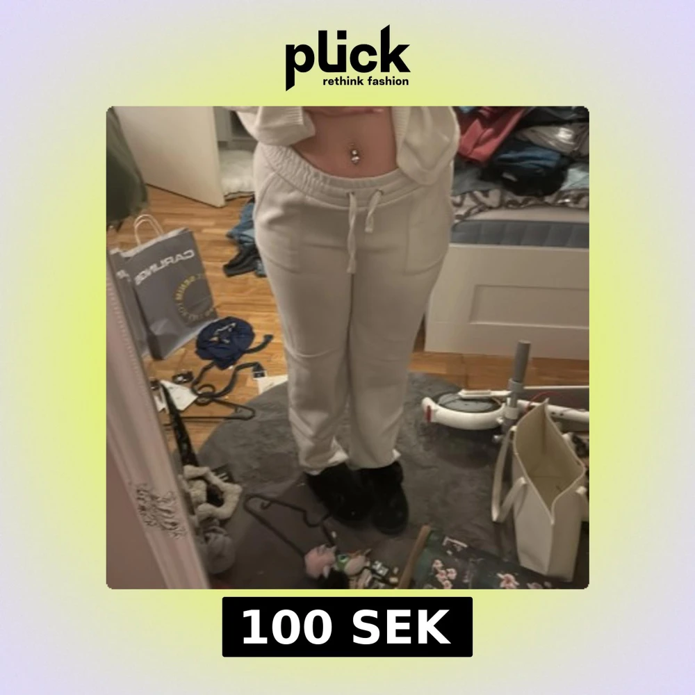 Säljer ett par vita mjukisbyxor med snörning i midjan från lager 157. Byxorna har en avslappnad passform och är perfekta för en bekväm stil. De har fickor på sidorna och är gjorda i ett mjukt material.