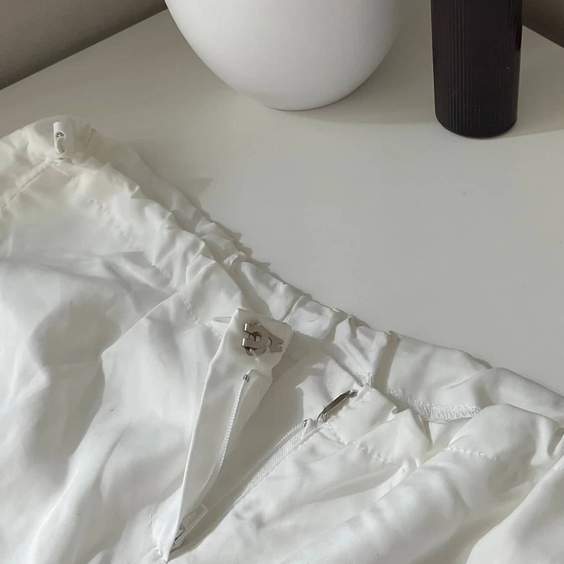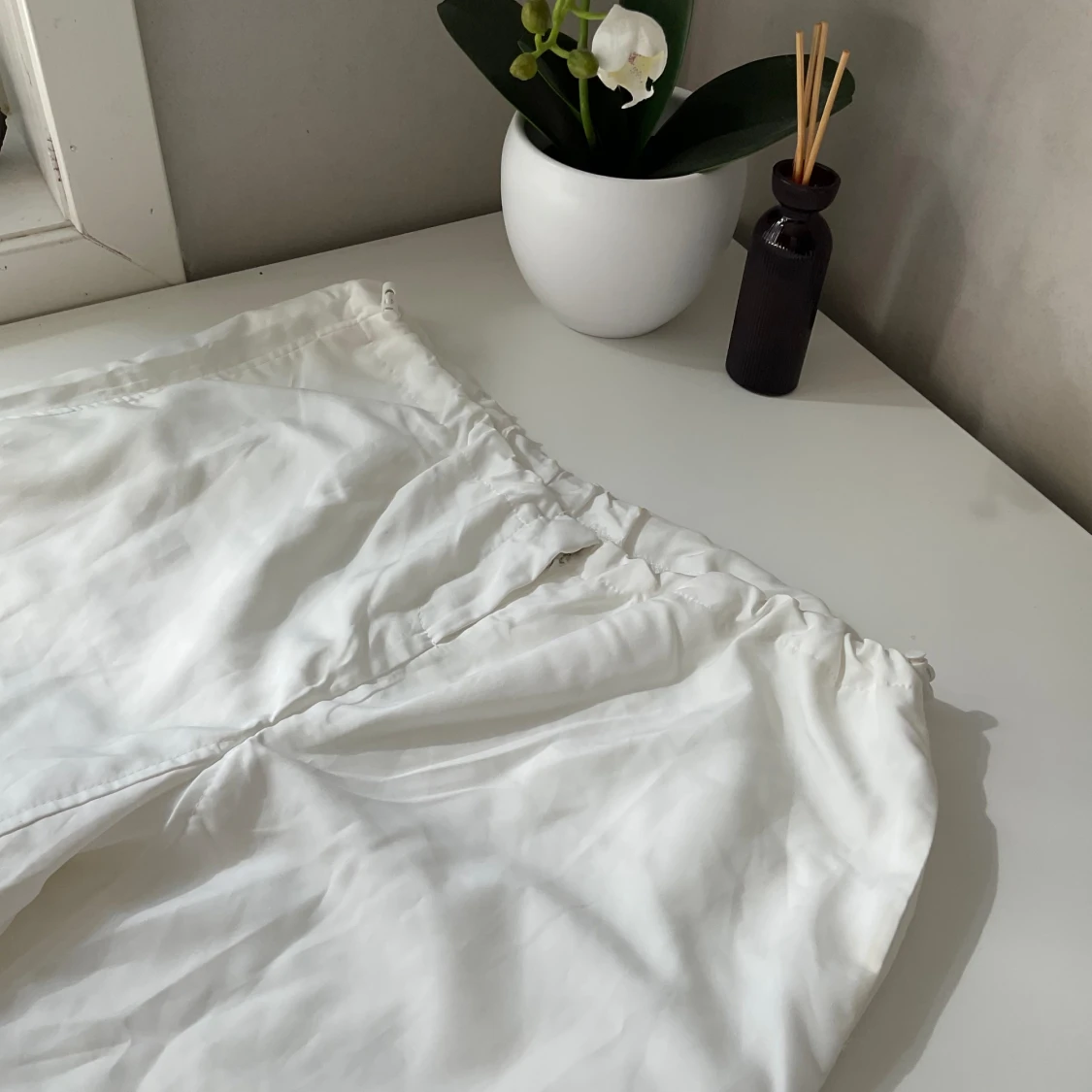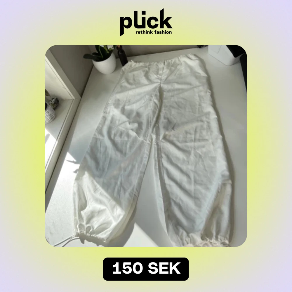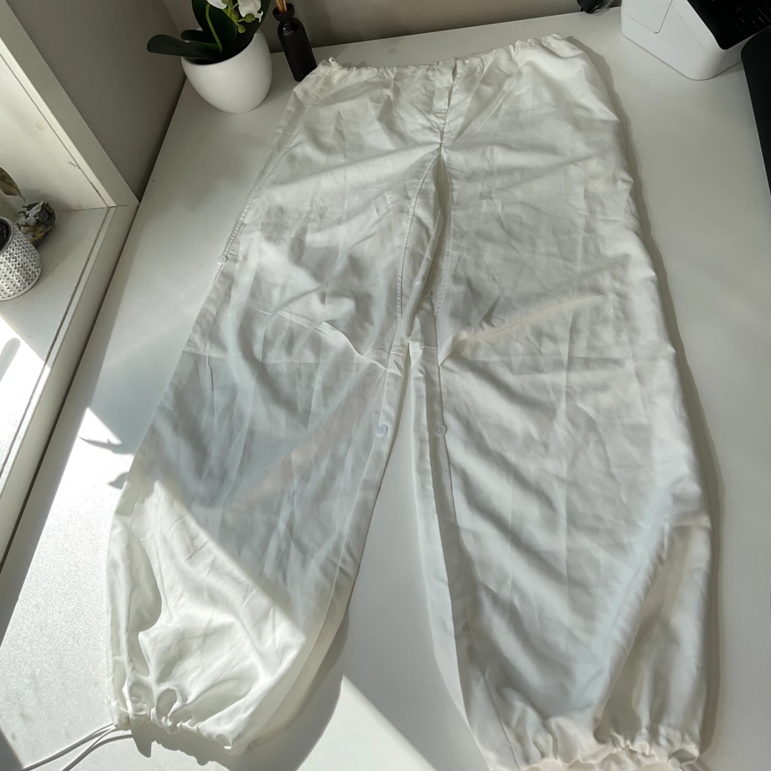Vita parachute pants. Storlek M. Säljer då de aldrig kom till användning. Pris kan diskuteras.