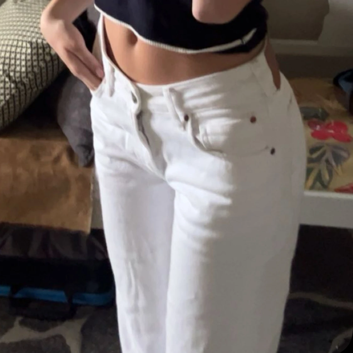 Säljer ett par vita jeans med raka ben från bikbok. De har låg/medelhög midja och är i storlek 24 och längd 32.