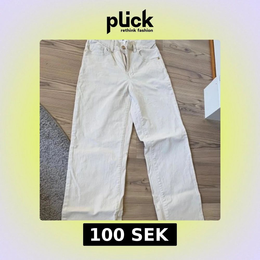 Säljer ett par vita jeans från Object med raka ben och hög midja. Byxorna har klassisk femficksdesign, bälteshällor och stängs med dragkedja och knapp. Materialet är kraftig bomull med en clean look, perfekt till sneakers eller boots.
