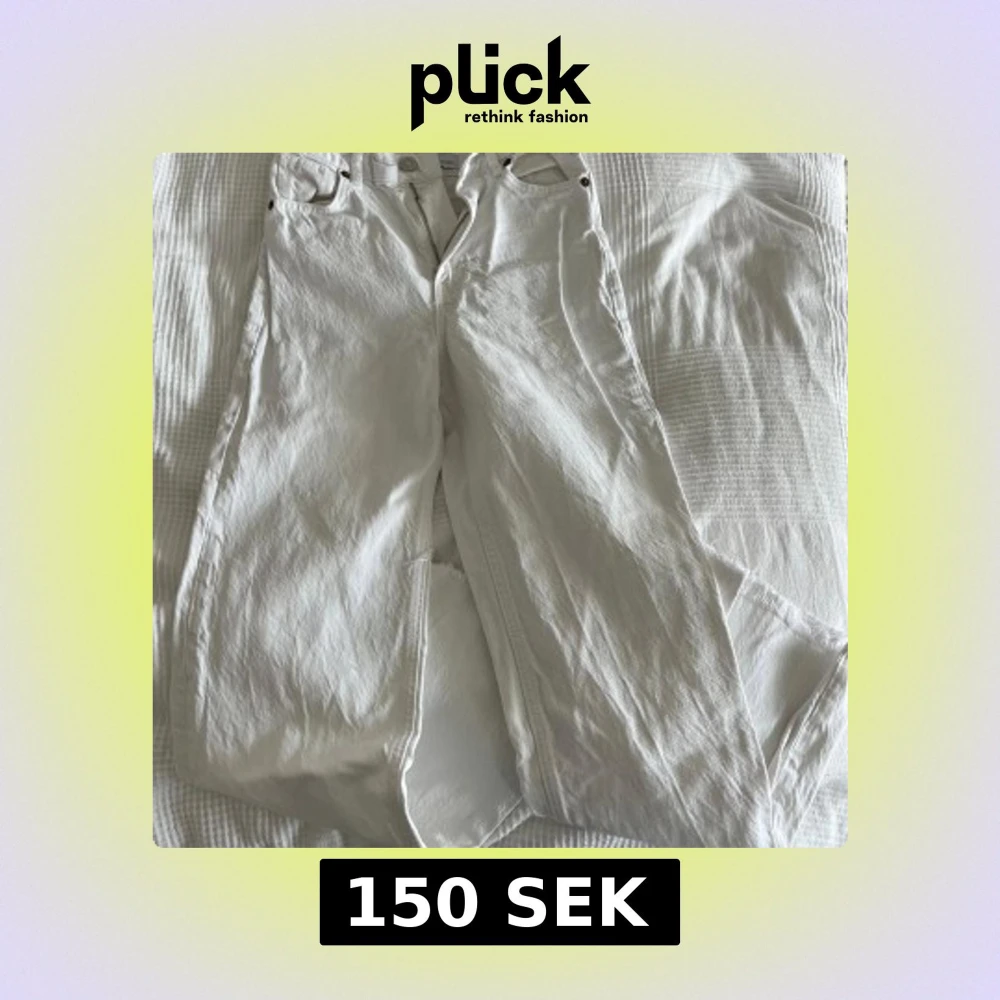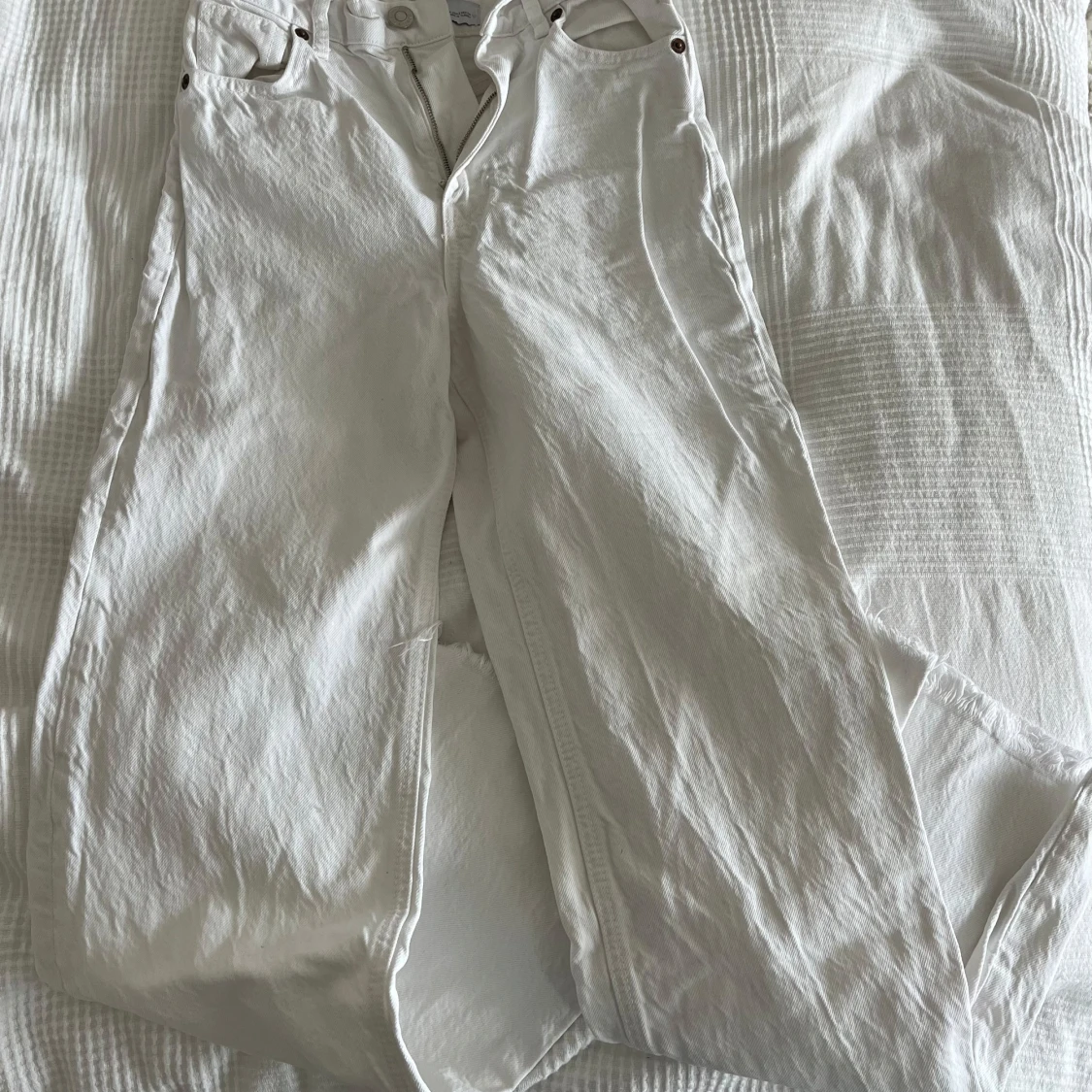 Säljer ett par vita mid waisted jeans med rak passform från Zara 🤍
