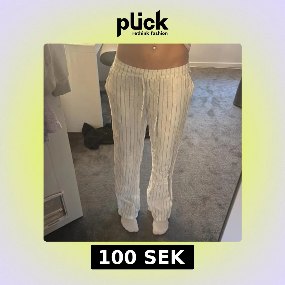 Säljer ett par vita linnebyxor från Madlady med svarta tunna ränder. Byxorna är i längden REGULAR och i storlek XS. (Jag stryker byxorna innan leverans)