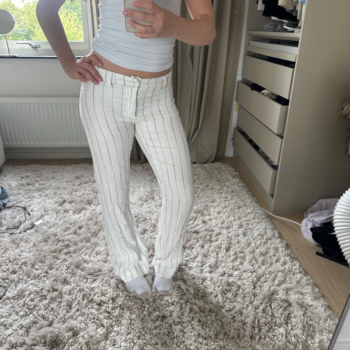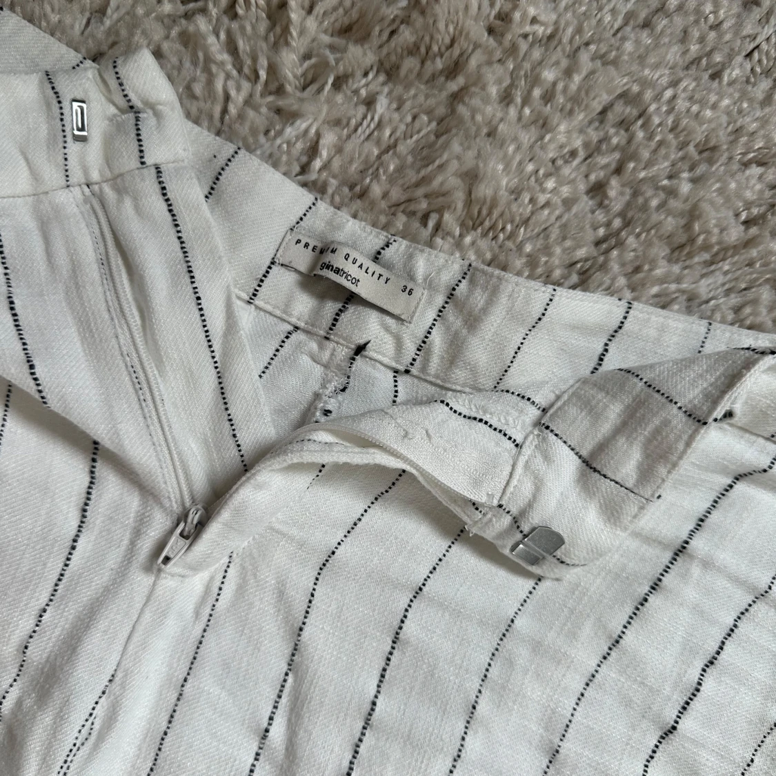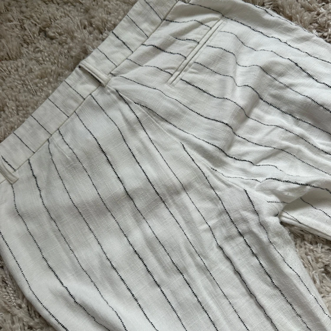 Snygga vita linnebyxor med svarta tunna ränder. Byxorna har medelhög midja, raka ben och bälteshällor. De har en ficka bak och stängs med dragkedja och knapp. Perfekta för en chill och stilren look.