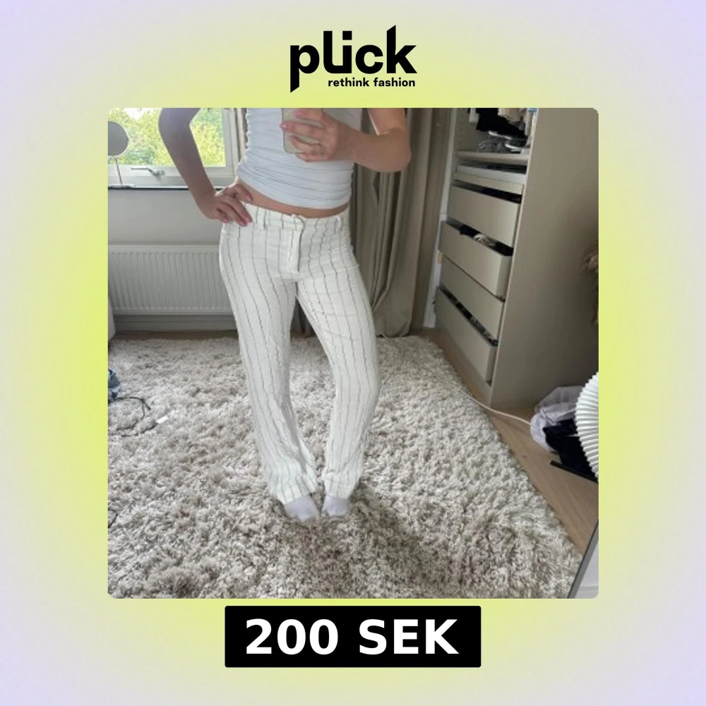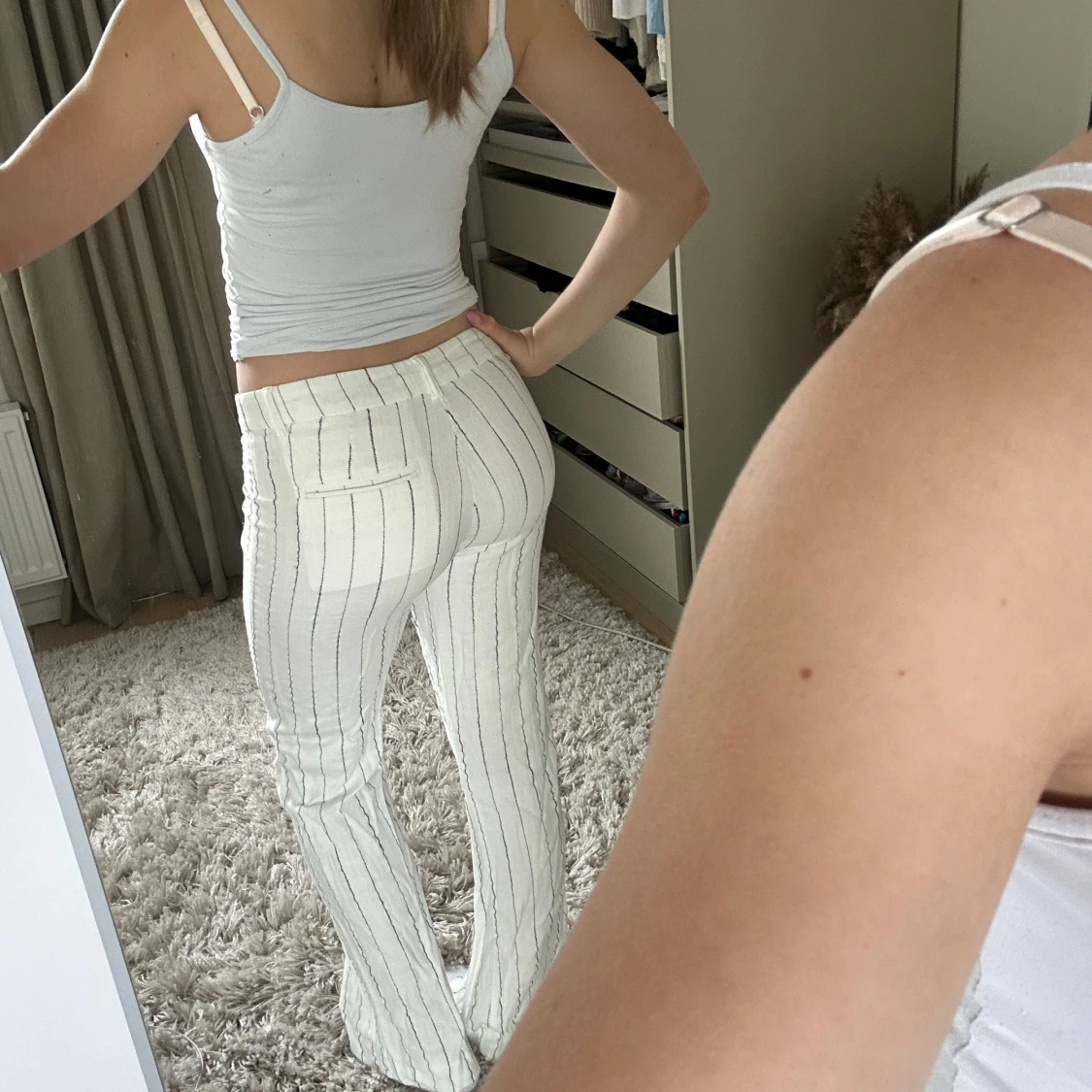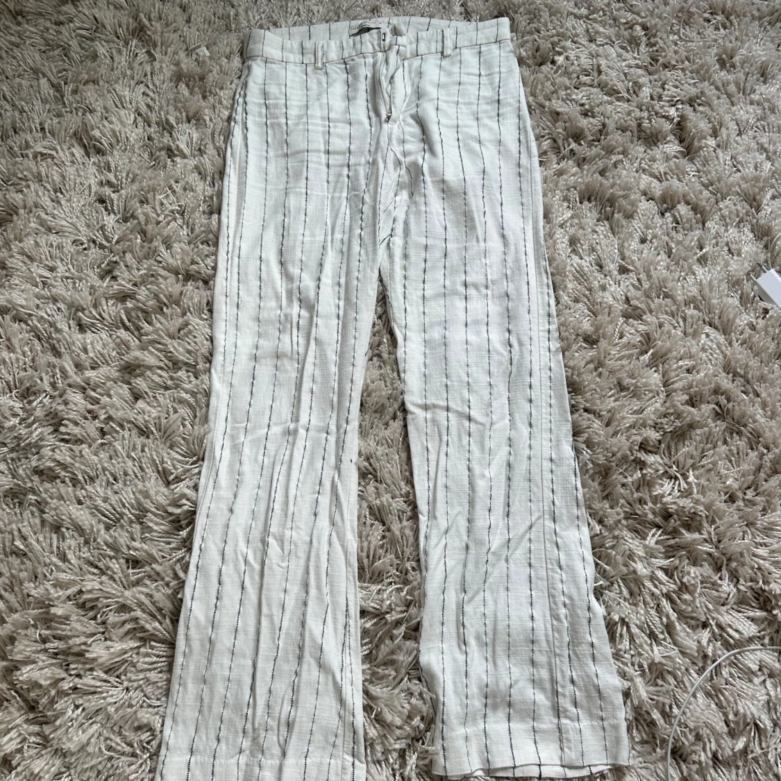 Snygga vita linnebyxor med svarta tunna ränder. Byxorna har medelhög midja, raka ben och bälteshällor. De har en ficka bak och stängs med dragkedja och knapp. Perfekta för en chill och stilren look.