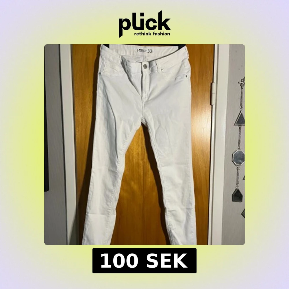 Säljer ett par vita skinny jeans från i storlek W 33. Modellen har fem fickor, knapp och dragkedja framtill samt smal passform som sitter tight längs benen. Materialet är mjukt och stretchigt för extra komfort. Liten fläck, visas på bild.