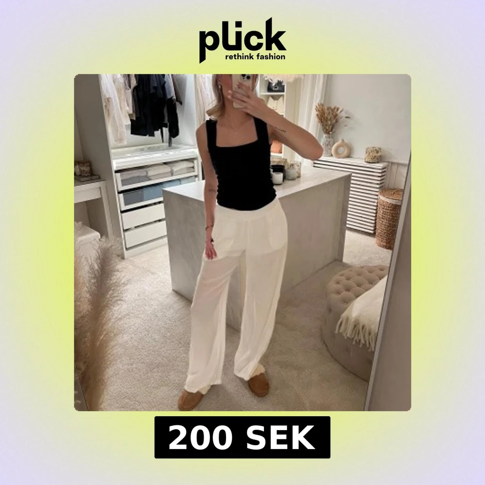 Snygga vita vida byxor med hög midja från Bershka. Väldigt tunna och sköna! De är tillverkade i ett lätt och luftigt material som ger en skön känsla. Jag är 173 cm för referense 🤎🤎