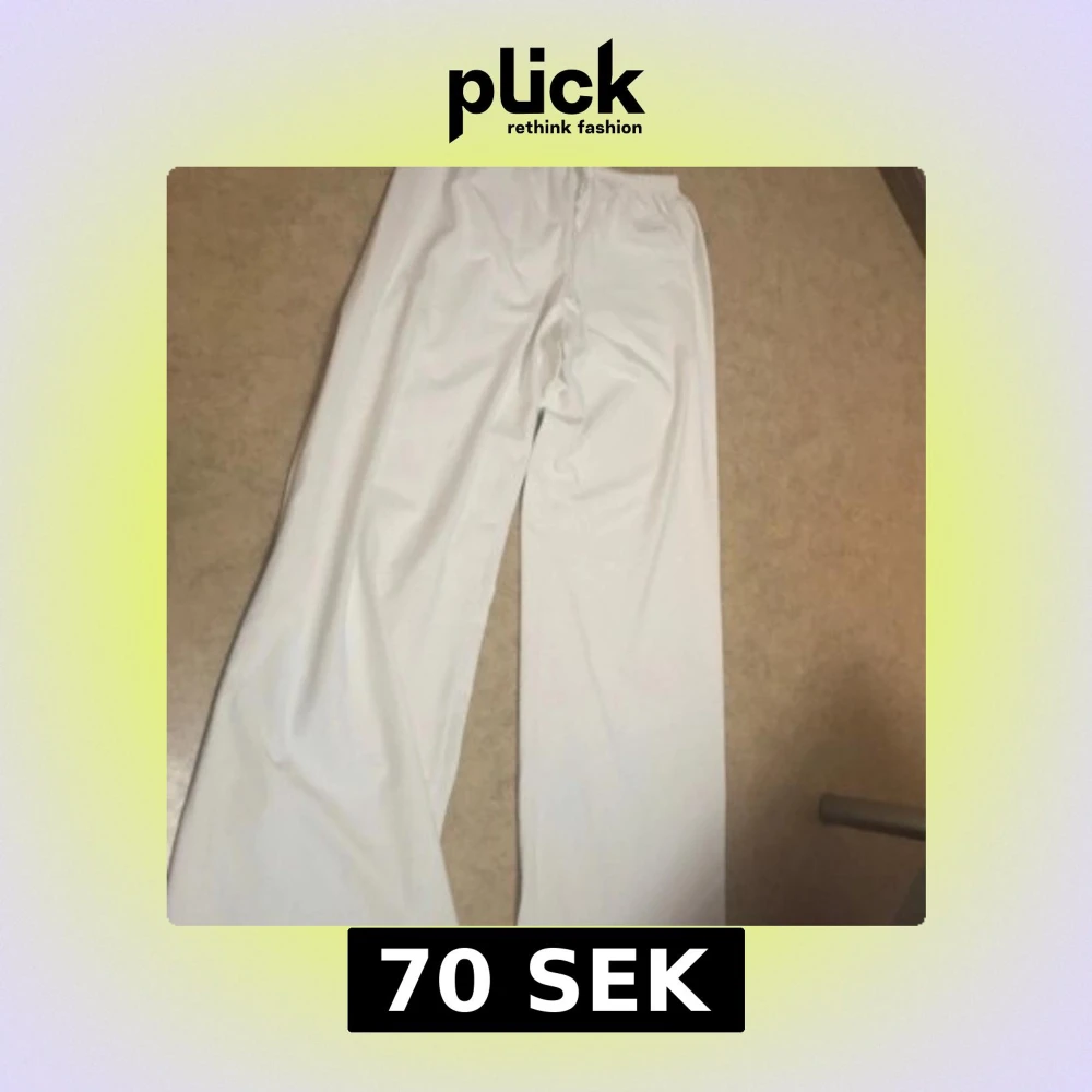 Säljer ett par helvita byxor med rak och vid passform. Byxorna har elastisk midja för extra komfort och är tillverkade i ett lätt material som passar perfekt till varmare dagar. Använt en gång eftersom för lång för mig inte genomskinlig