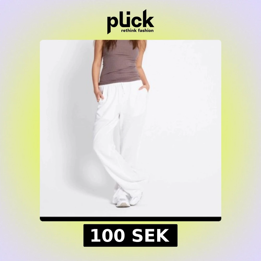 Säljer ett par fräscha vita linnebyxor med bred passform och elastisk midja med snörning. Byxorna har fickor på sidorna och en bakficka,