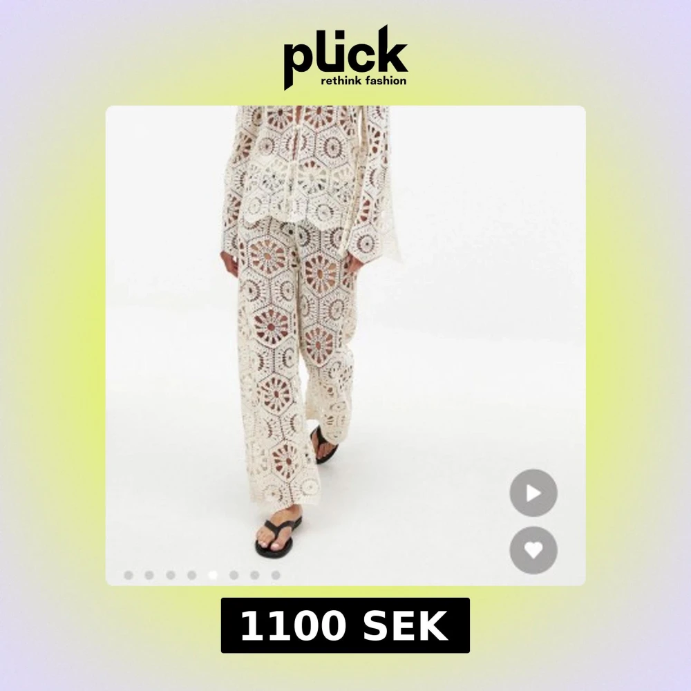 Säljer ett par vita virkade byxor med blommönster och breda ben. Byxorna har en transparent look och är gjorda i ett stickat material med coola geometriska och blommiga detaljer. Perfekt för dig som vill sticka ut med en unik och bohemisk stil. Endast testat men kunde inte lämna tillbaka då det hade gått för många dagar