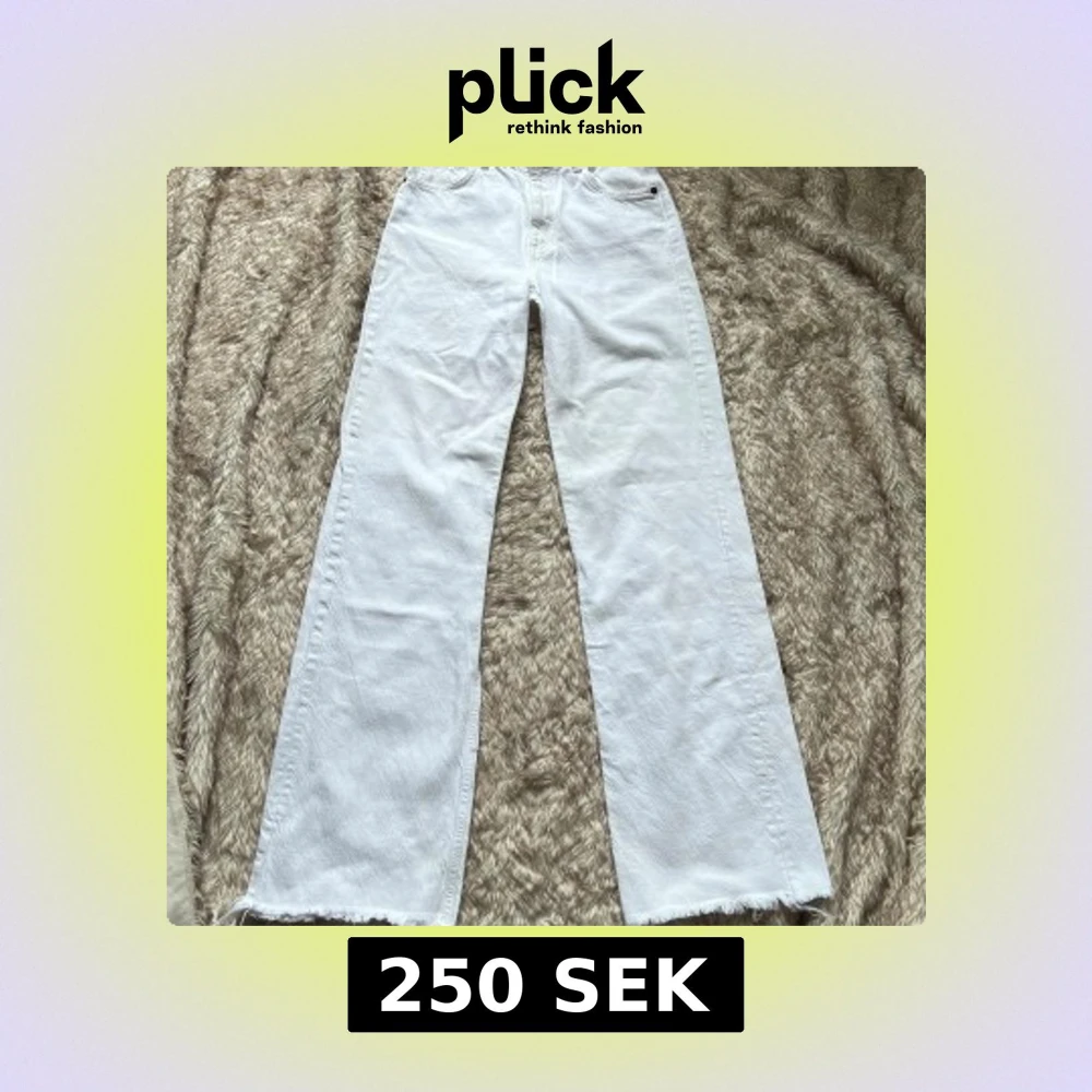 Säljer ett par vita jeans från Zara i storlek 36. Jeansen har hög midja och är vida. Midja tvärsöver 35 cm, Innerbenslängd 85 cm.