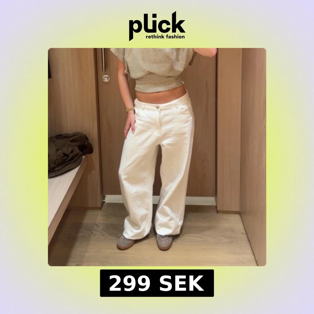 Säljer ett par skor snygg vita wide jeans, väldigt trendiga. Jag är 160 och har vikt upp dem ungefär 10cm då jag har ganska korta ben😅☺️🥰