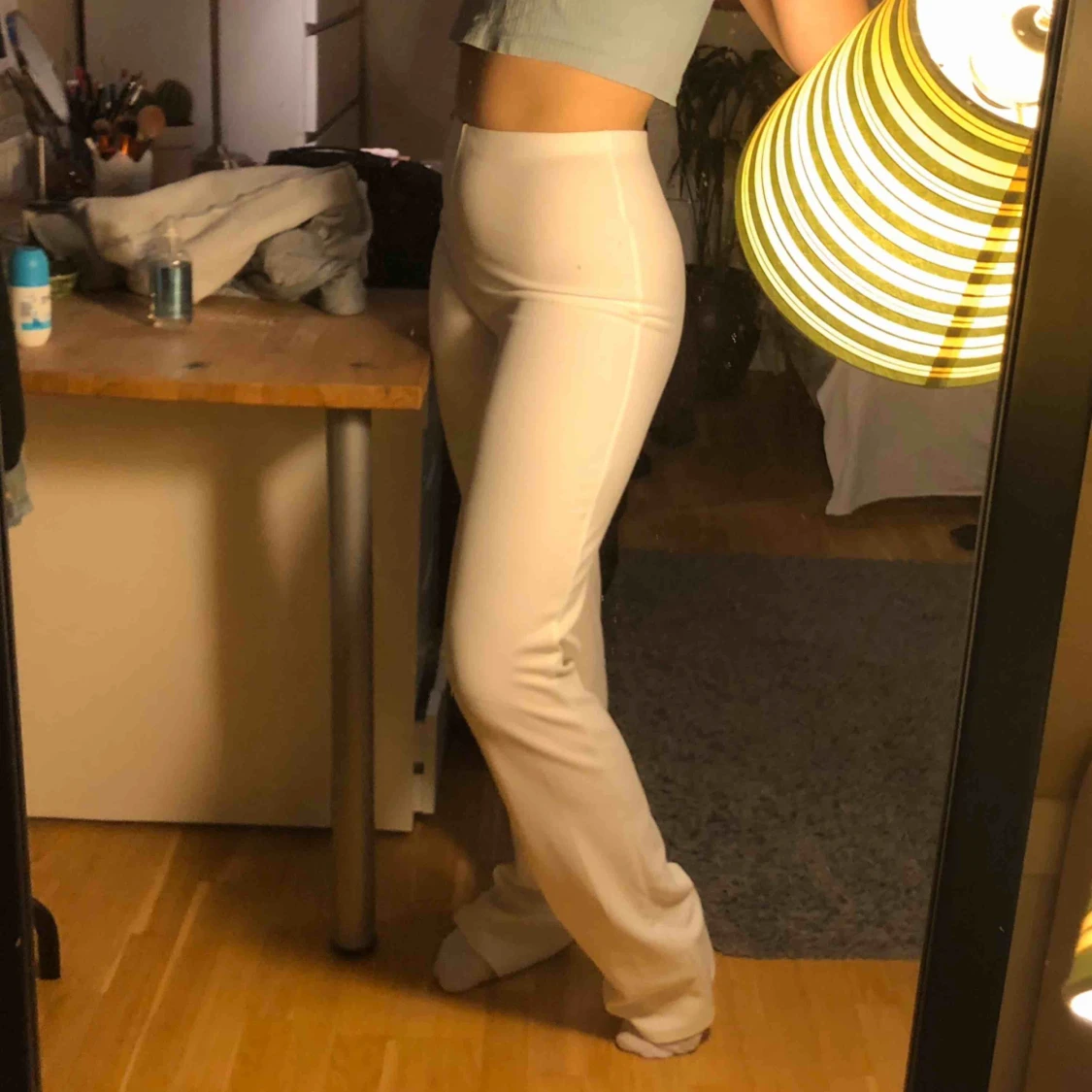 Vita byxor från Nelly, använda endast 1 gång! Säljer pga för långa i benen så man kanske kan sy upp dom eller något liknande. Kan mötas upp i Stockholm eller frakta.