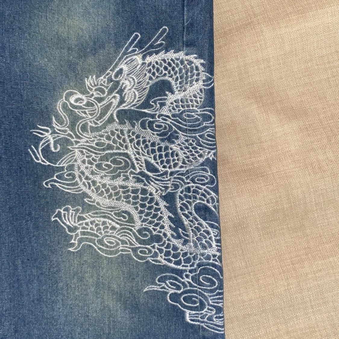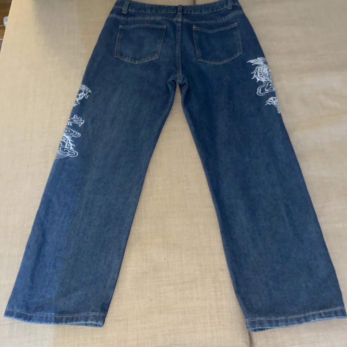 Ett par blåa drakebroderibyxor de har väldigt bra material och har används ett par gånger och de är baggy.