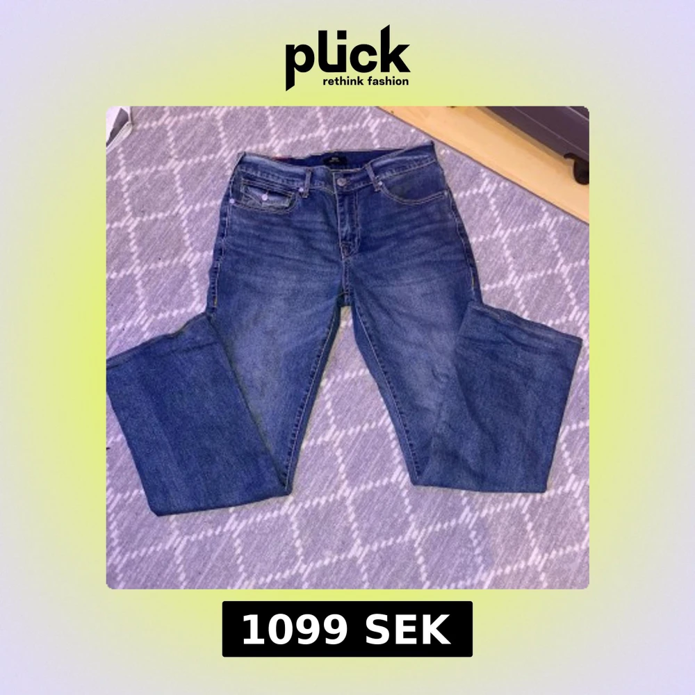 Säljer ett par klassiska blå jeans från True Religion med bootcut passform. Jeansen har ikoniska bakfickor med kontrastsömmar och tryckknappar, samt en tydlig True Religion-patch bak i midjan. Tillverkade i slitstarkt denim med snygg tvätt. Har klippt där nere på byxor har sytt om för att passa bättre, men de är fortfarande asså långa🤟🏽har använt de kanske 4 gånger