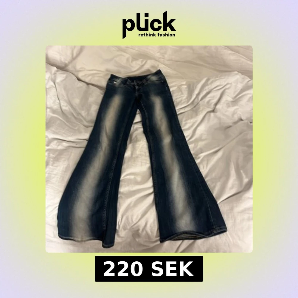 Säljer ett par snygga bootcut jeans från Cheap Monday i mörkblå tvätt med ljusa slitningar. Jeansen har klassisk femficksdesign, normal passform och är tillverkade i jeansmaterial med stretch. Perfekt för dig som gillar retrovibbar och vill sticka ut med breda ben. W 23
