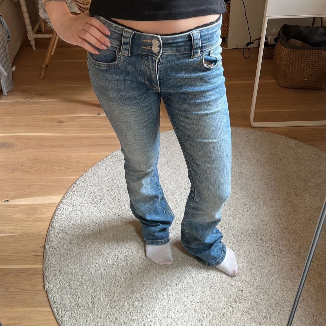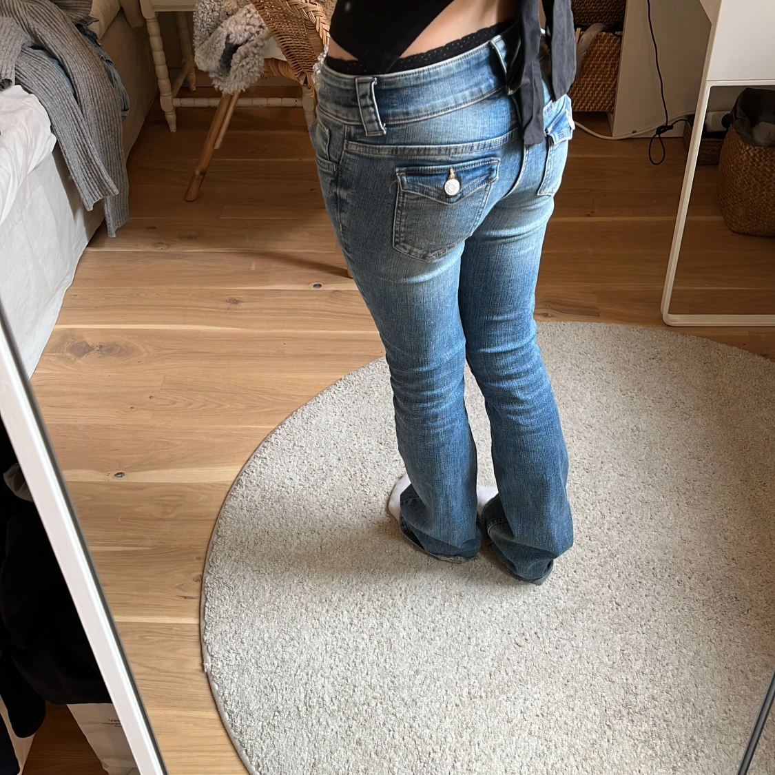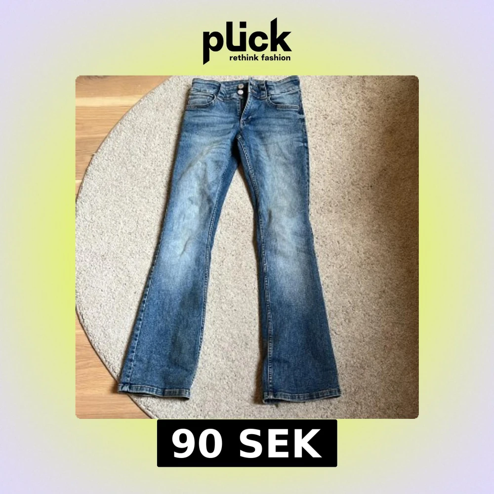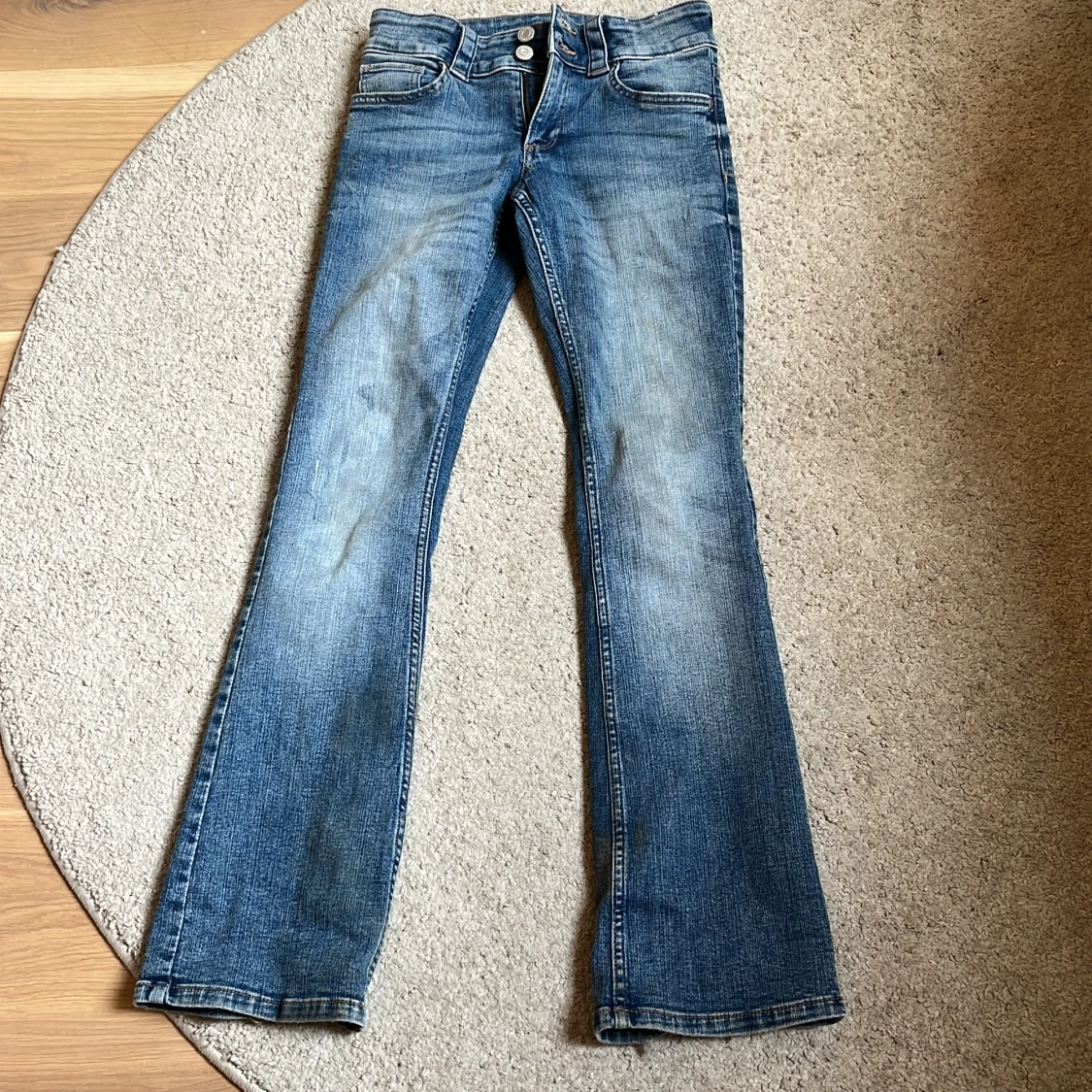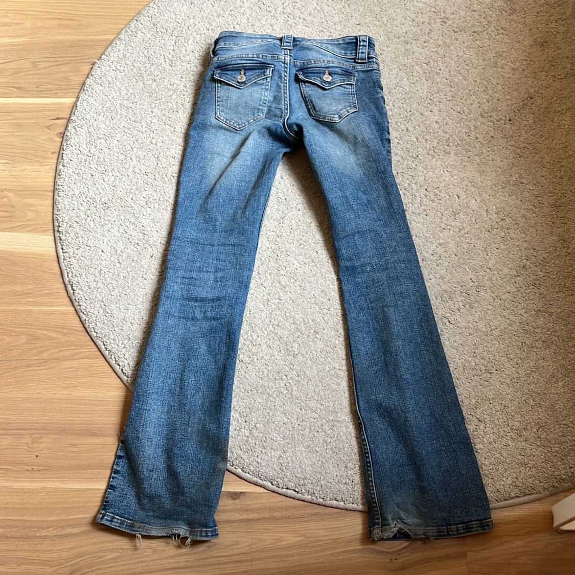 Säljer ett par klassiska blå jeans med bootcut och låg midja. Jeansen har två knappar framtill, fickor både fram och bak samt lätt slitna detaljer vid benslut. Perfekta för dig som gillar en retro vibe och vill ha ett par jeans som sticker ut.