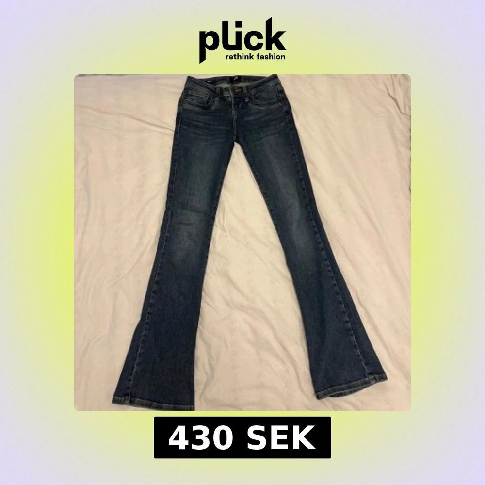 Snygga mörkblå Low Rise bootcut jeans från Valerie i klassisk femficksmodell. Jeansen har en lätt utsvängd passform nertill och är tillverkade i ett mjukt denimtyg. Perfekta för dig som gillar en tidlös och trendig look. Säljer pågrund av att de har blivit alldeles för små runt midjan och rumpan