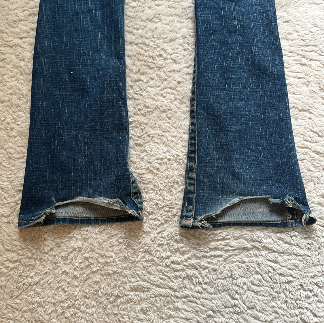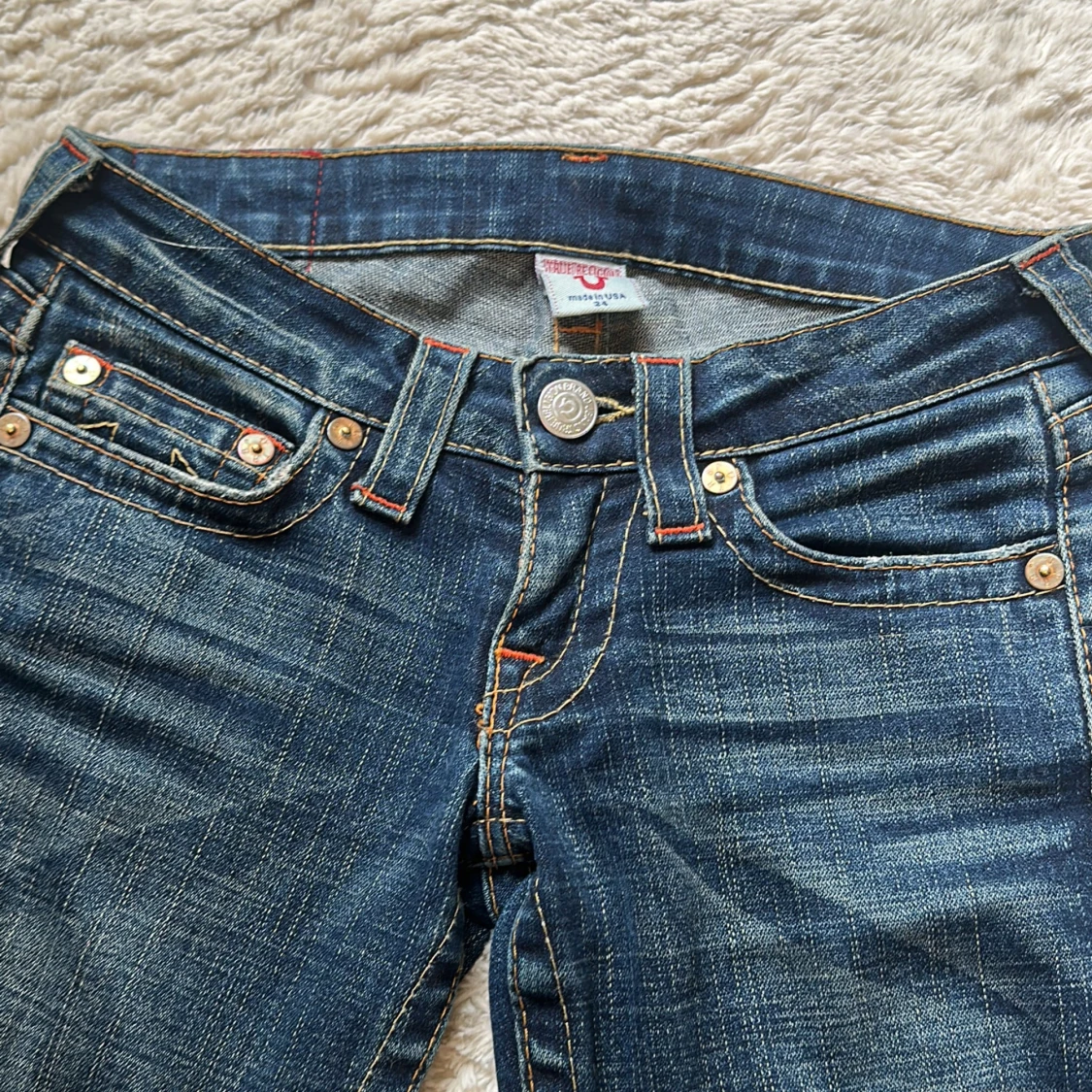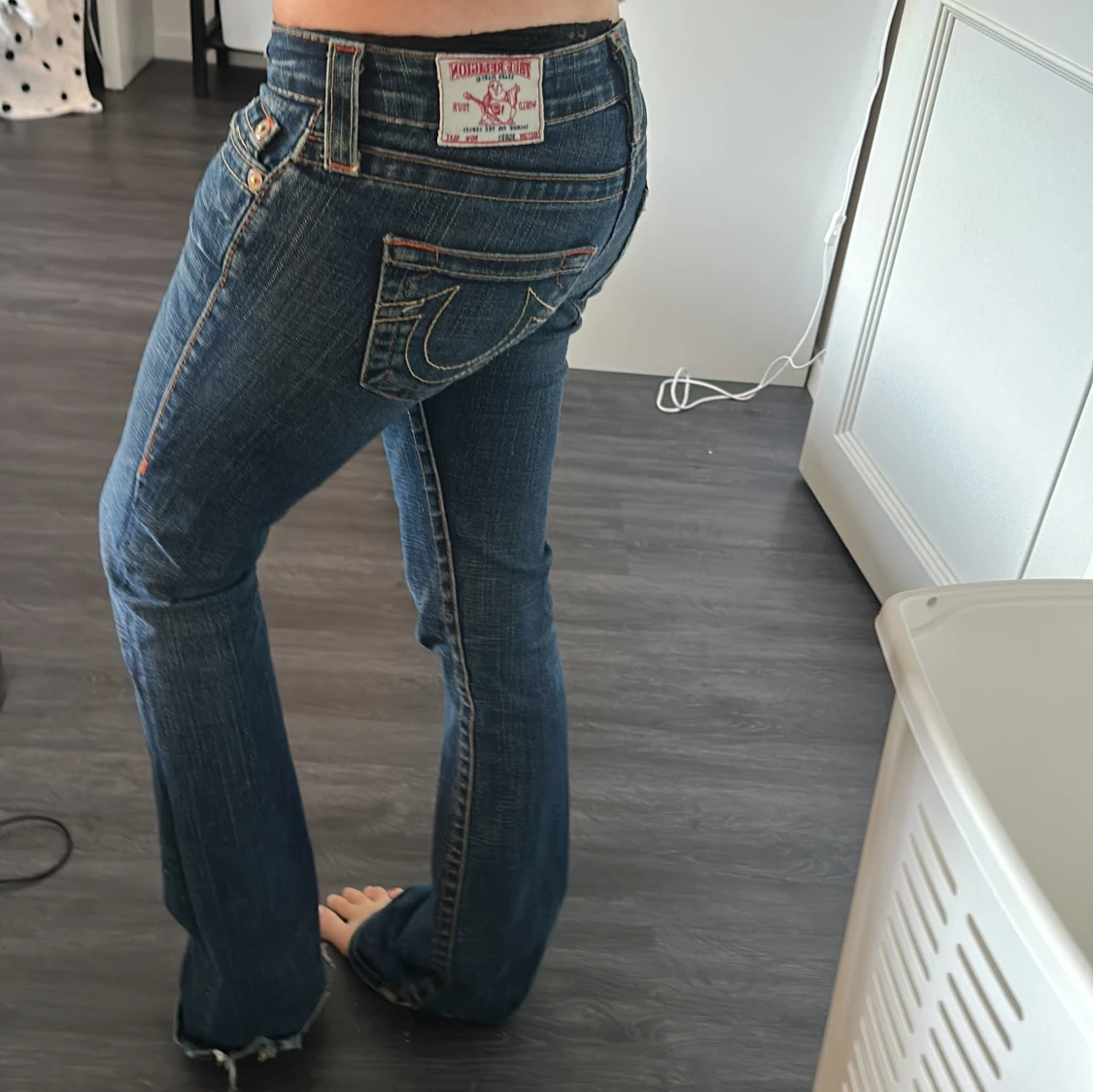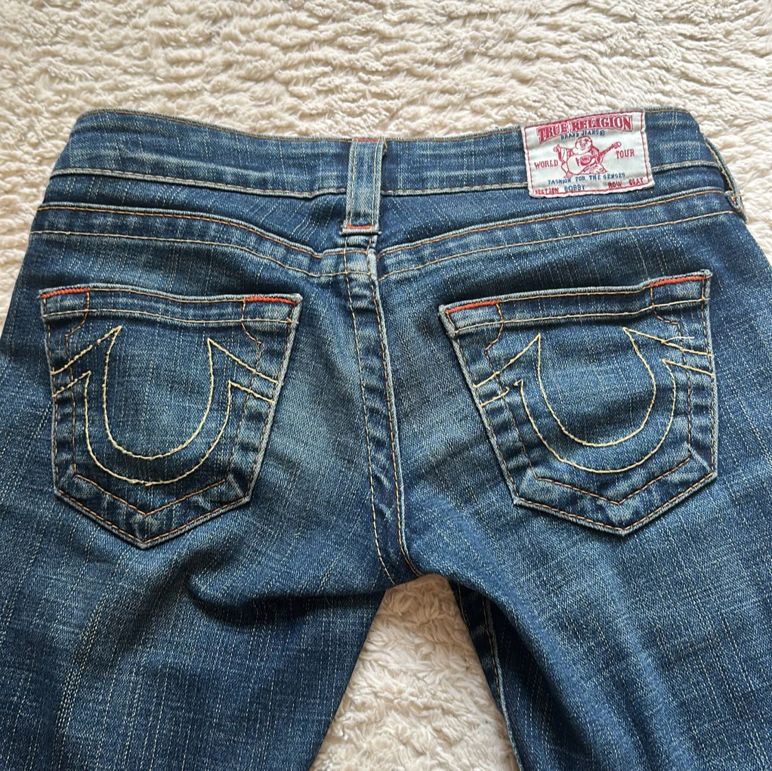 Skit snygga vintage true religion jeans som jag ÄLSKAR men som tyvärr blivit för små! ❤️Det är en gammal modell som inte säljs längre och de är super lågmidjade och bootcut! slitna på baksidan vid hälarna men inget man tänker på när de är på, men där av det lite billigare priset! ❤️ midjemått 37 cm och innerbensmått 85 cm! Strl w24 men skulle säga att de passar w25 också! ❤️Pris är dirkuterbart!