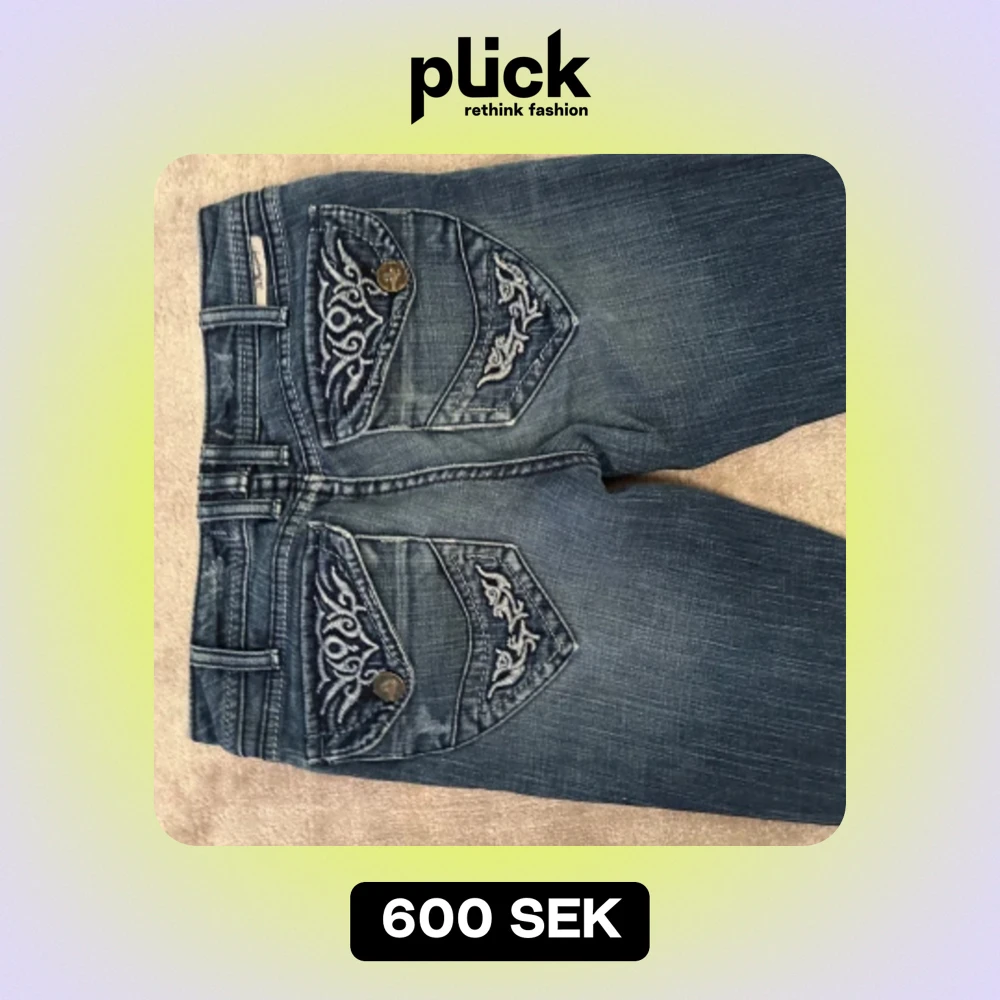 Säljer ett par snygga blå jeans med coola broderade detaljer på bakfickorna. De har en klassisk femficksdesign och är i en skön denimkvalitet. Perfekta för en avslappnad vardagslook!