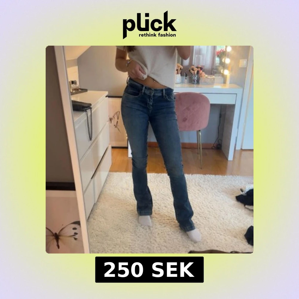 Säljer ett par snygga blå jeans med bootcut-modell och skulle säga att de mid waist. Jag är ca 163 och tycker de för långa på mig tyvärr, de är från ltb i storlek w25/L34