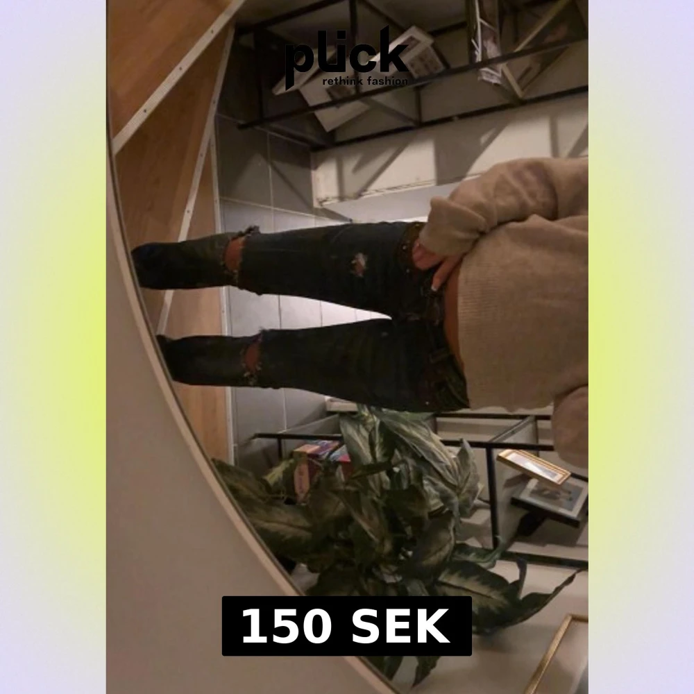 Säljer ett par mörkblå jeans, bootcut och hål vid knäna. Med extra detalj vid framfickorna och högre bak. Säljer på grund av att de ej passar mig längre🥲💕