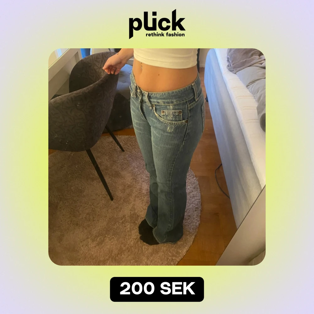 Säljer ett par snygga blå jeans i bootcut-stil. De är väldigt lågmidjade och lite bredare i benen. As snygga men lite långa för mig som är 157! Längd 32