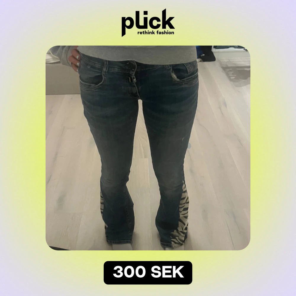 Säljer ett par snygga blå jeans med zebra-detaljer vid benen