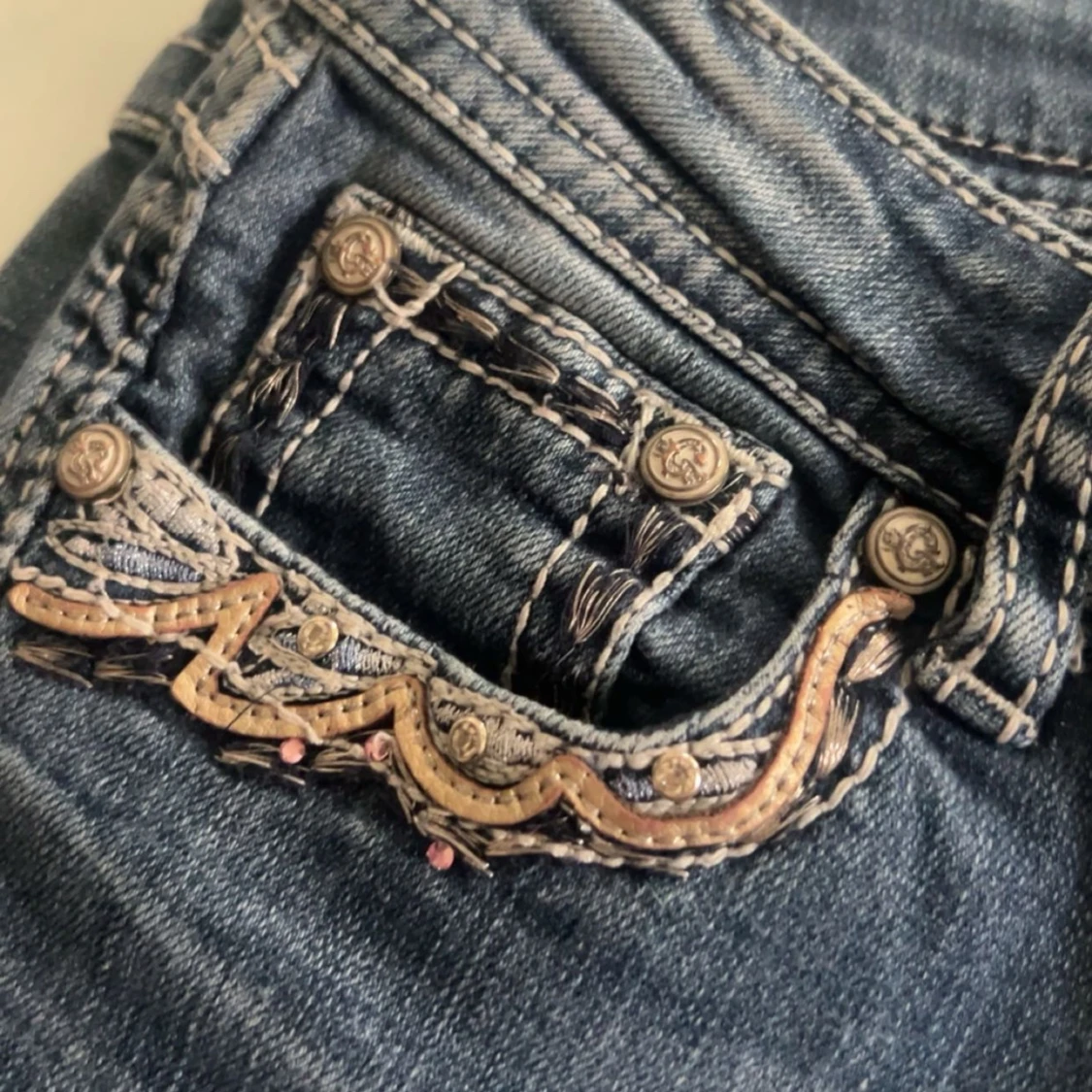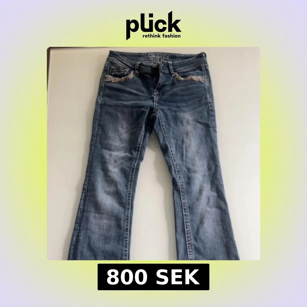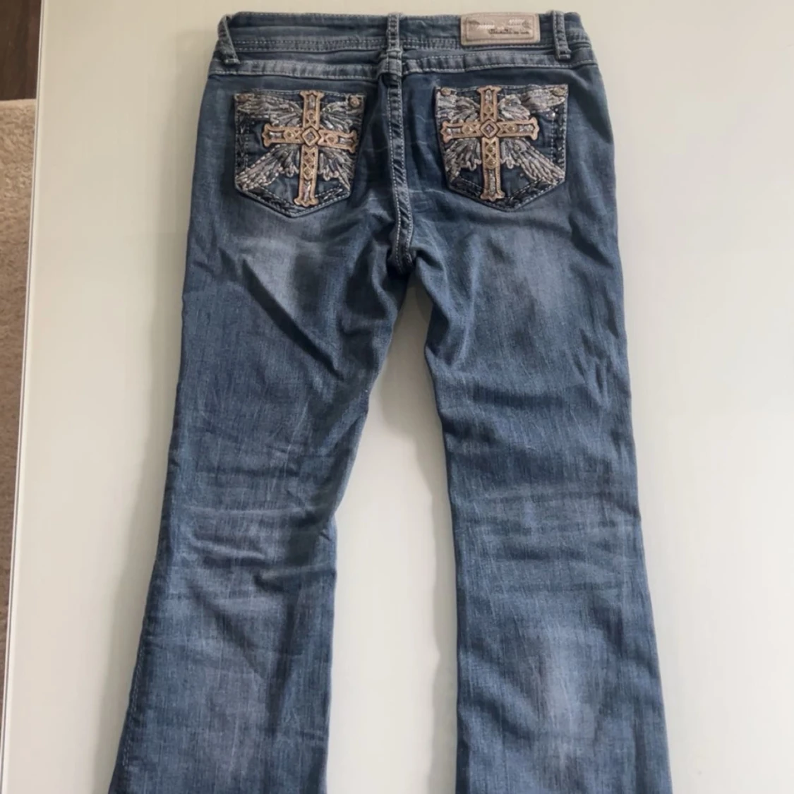 Snygga blå jeans med unika broderade detaljer på fickorna och bakfickorna. De har en bootcut-stil och låg midja, vilket ger en avslappnad och trendig look. Perfekta för dig som vill ha något extra i din garderob.