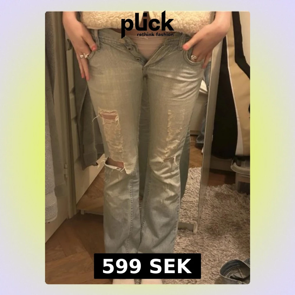 Säljer ett par ljusblå bootcut lowwaisted jeans! Köpta här på plick med passade inte tyvärr.💕midjemåttet är 31, innerbenslängden 80! (Inte mina bilder). Två hål i rumpan men inget som syns jättemycket när jeansen sitter på.(se sista bild)