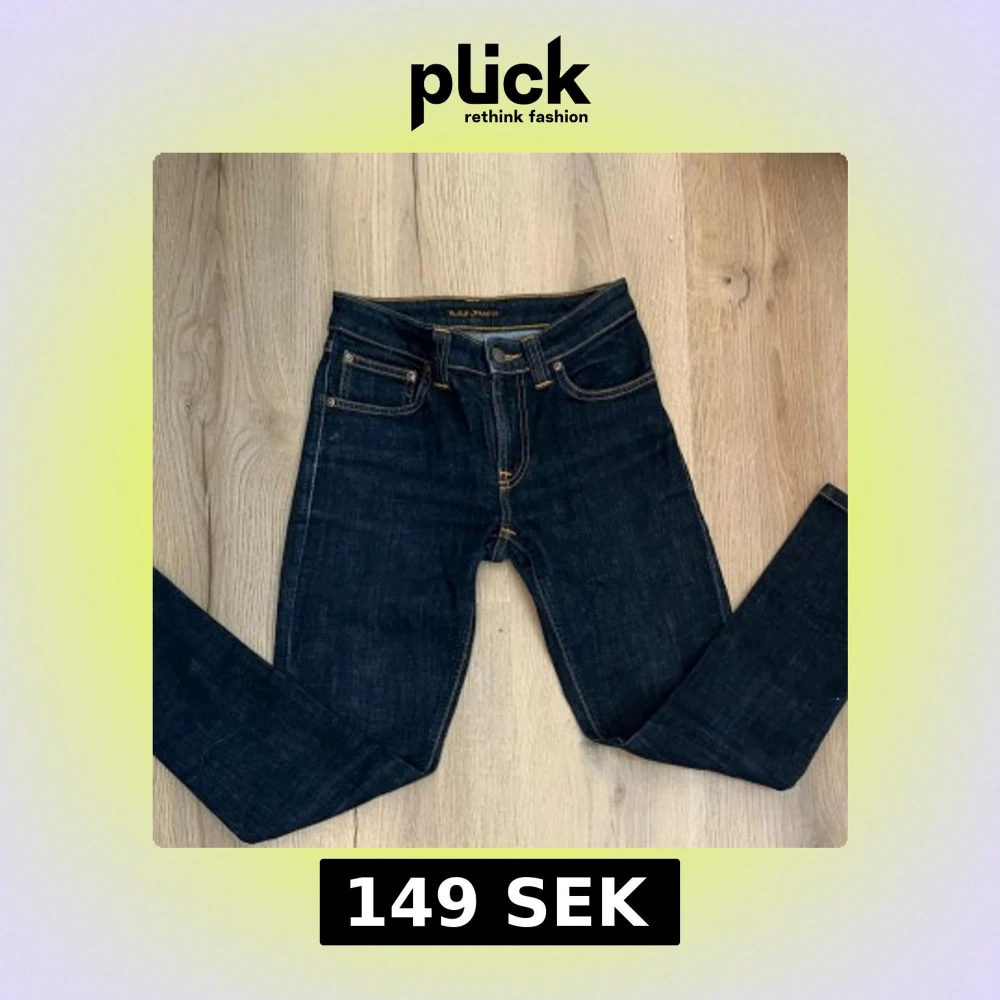 Snygga mörkblå jeans från Nudie Jeans med klassisk femficksdesign och kontrastsömmar. Modellen är skinny fit och har en smal passform hela vägen ner. Tillverkade i slitstarkt jeanstyg med orange detaljer och knappstängning framtill. Priset kan gå ner till 99kr om du följer oss på Plick och TikTok