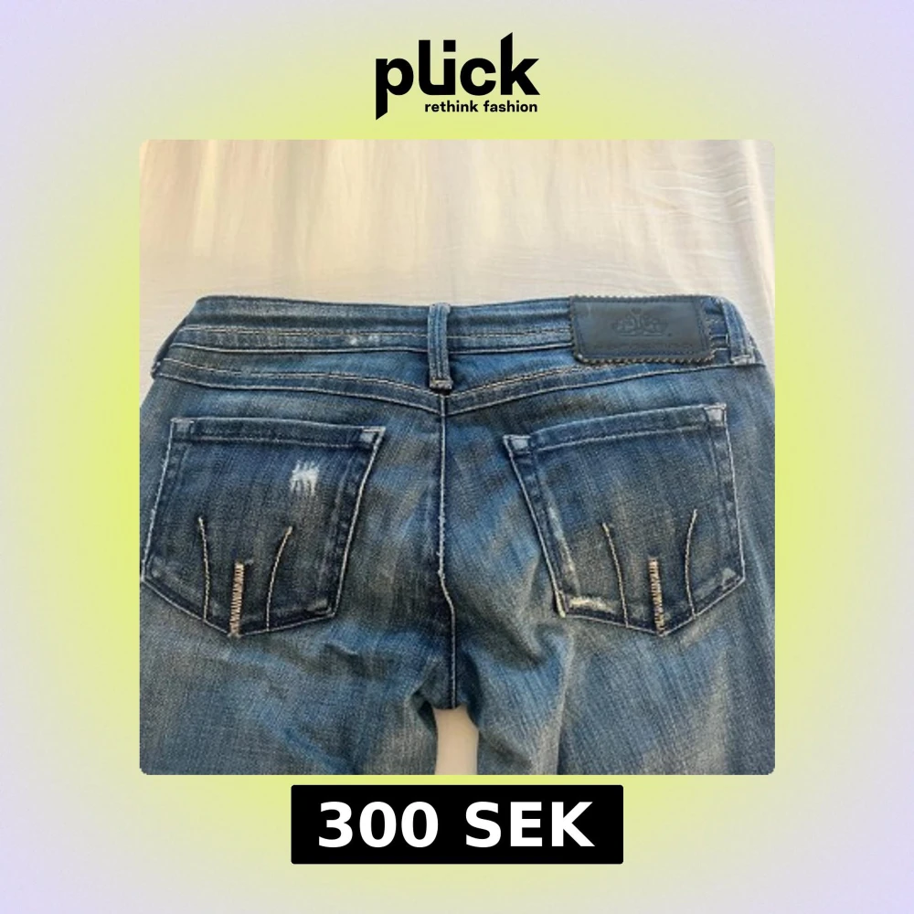 Säljer ett par blå jeans från Fornarina med bootcut-modell och låg midja. Jeansen har slitna detaljer och snygga detaljer på bakfickorna💕