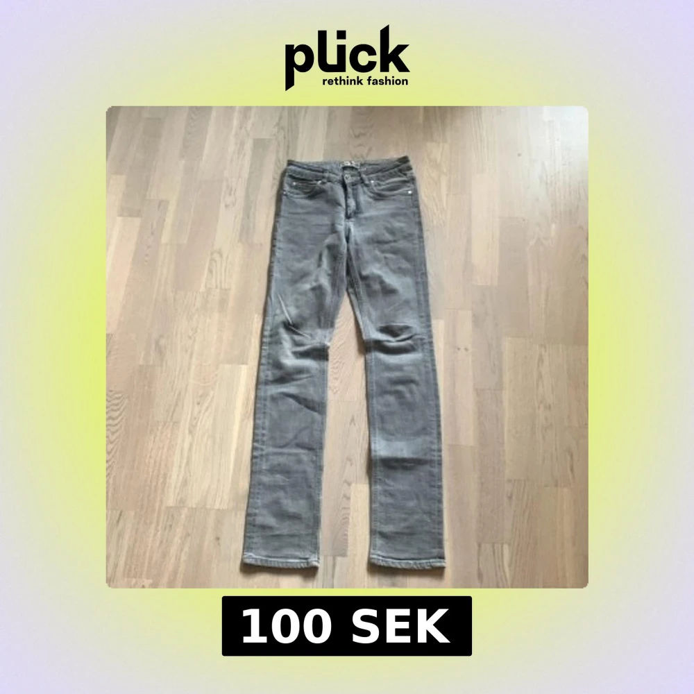 Säljer ett par grå jeansbyxor från Acne Jeans med klassisk femficksdesign och raka ben. Byxorna har normal passform och är tillverkade i ett mjukt jeanstyg. Perfekta för dig som gillar stilrena och enkla jeans.