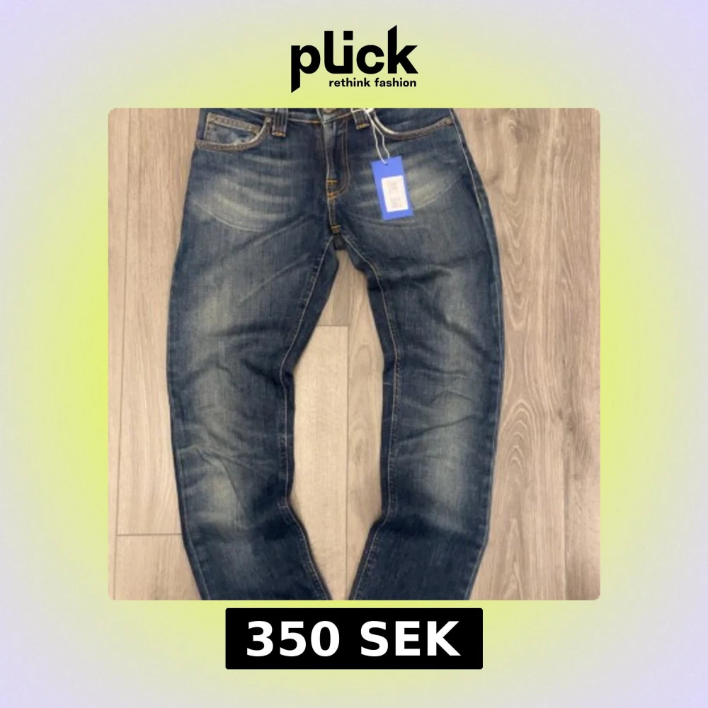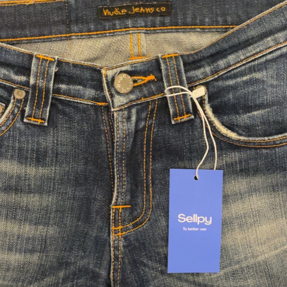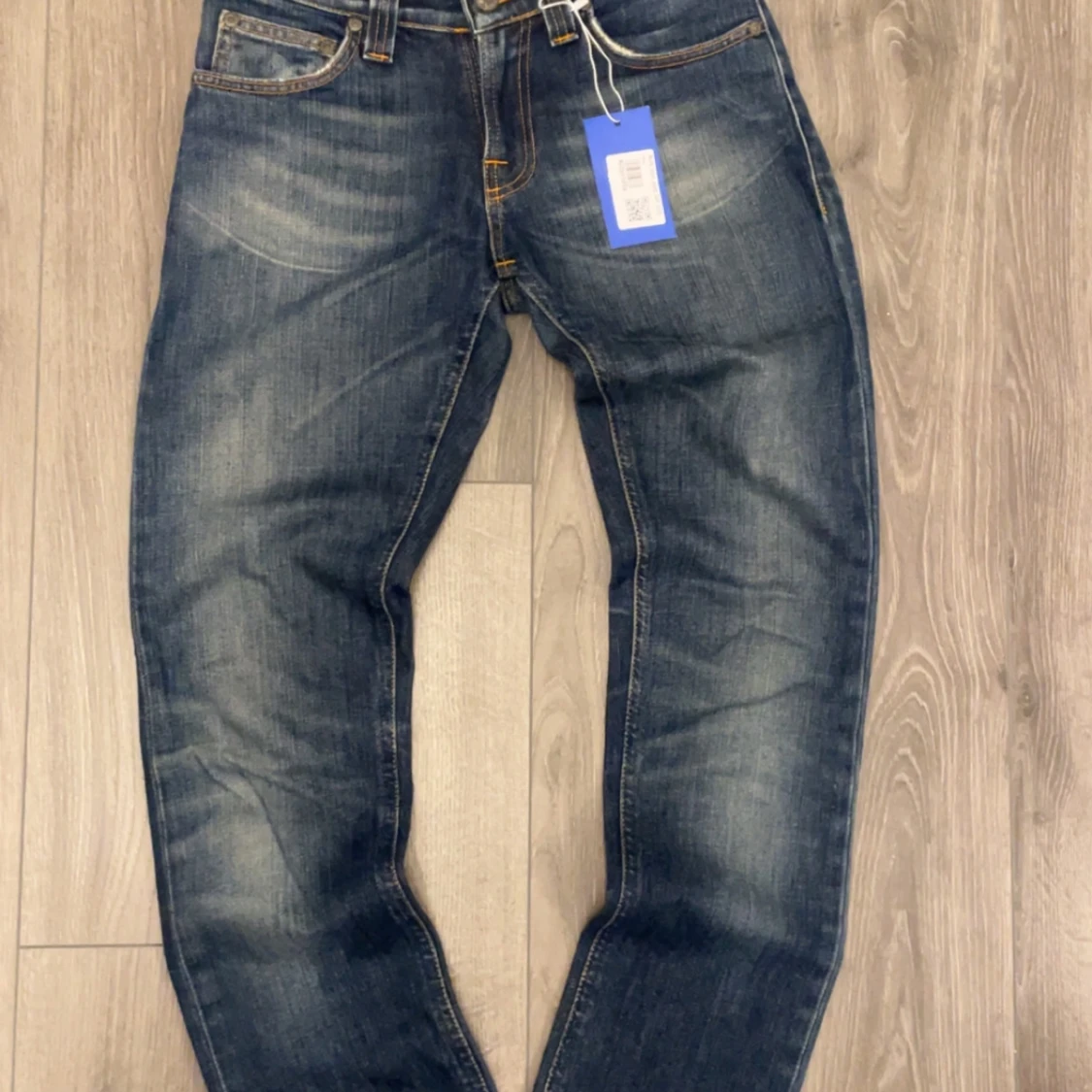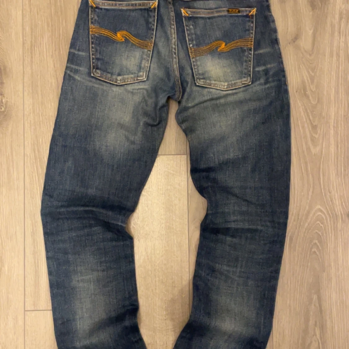 Säljer ett par klassiska blå jeans från Nudie Jeans Co med snygga slitningar och kontrastsömmar. Jeansen har fem fickor, orange detaljer och raka ben. Perfekta för dig som gillar en tidlös denimlook.